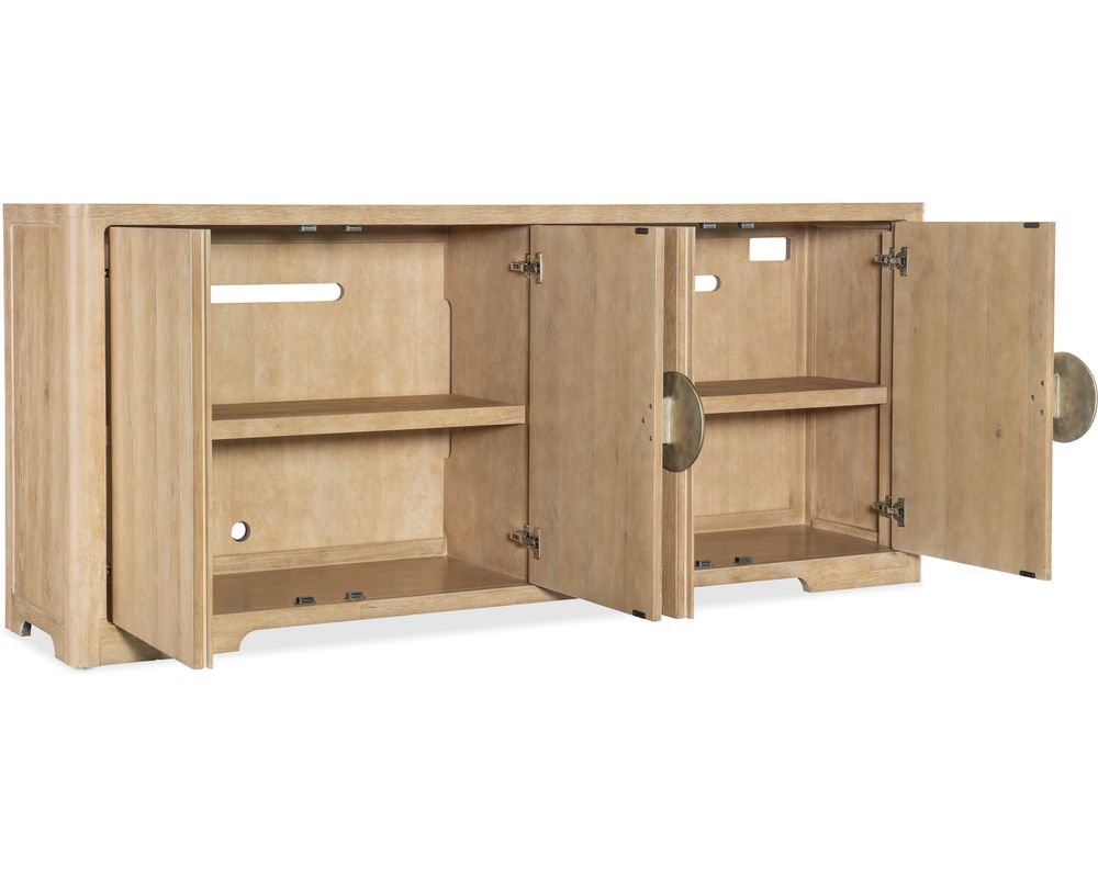 The Retreat Entertainment Credenza is essential for convenience. It has a 3-plug electrical outlet behind the right-side pair of doors, making it easy to connect and power your electronic devices. Say goodbye to messy cords and tangled wires and hello to a clutter-free entertainment area.