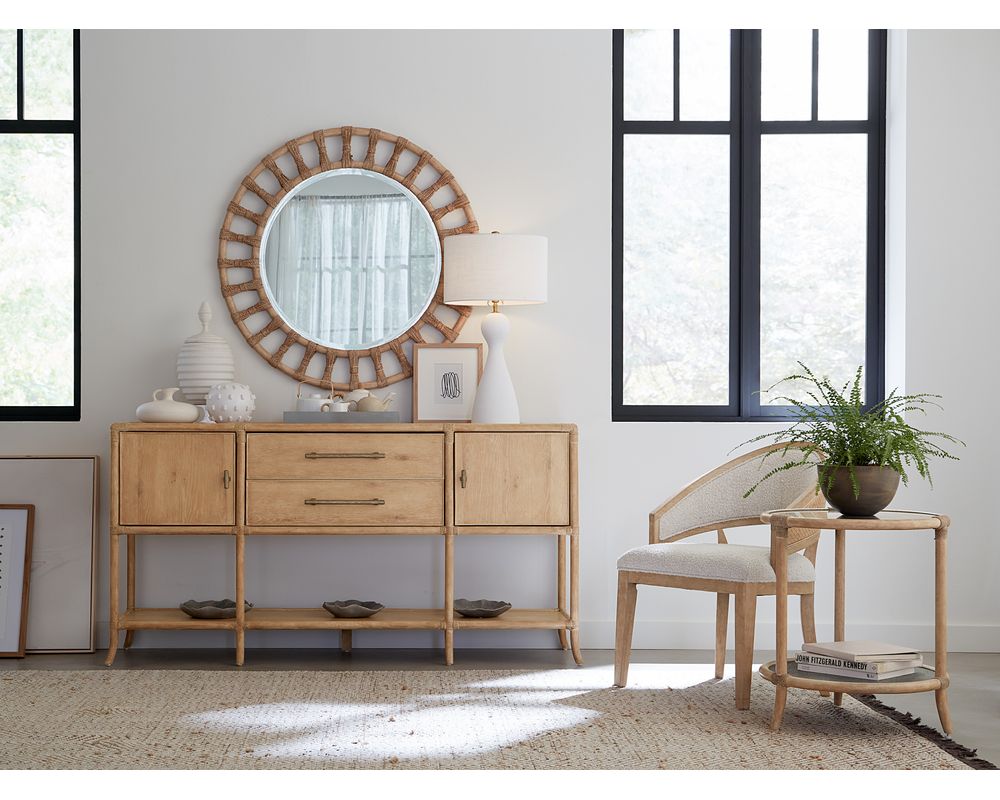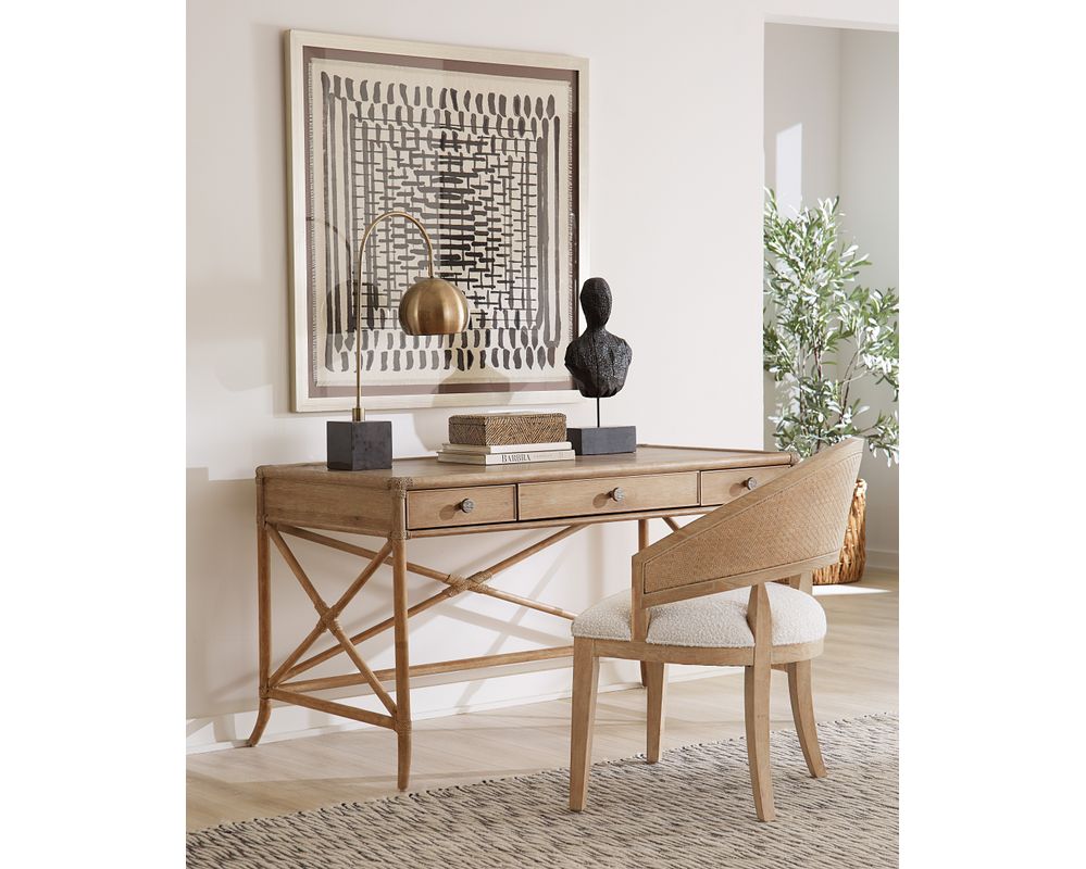 But that's not all. A few pops of accent finishes called Seagrass and Lagoon can be found on select pieces, enhancing the tropical mood of the collection. Modern Zen delivers a tranquil personality with a contemporary twist that showcases the Dune finish, enhanced with accent items in Black Sand. Several pieces incorporate woven cane, dramatic split bamboo-inspired accents, and Travertine stone. This collection is not just about style, it's about versatility. Highlights include a woven cane panel bed with clean, modern lines and various case pieces featuring geometric patterns and spa-inspired accents. Upholstered stationary and accent seating – available in sage and caramel tone leathers – complete the Zen narrative. Adding the finishing touch, the collection’s hardware is custom-designed to match each personality. Look for reed-inspired designs in Island Oasis and gently textured designs in Modern Zen. Both hardware options are featured in a soft pewter-plated finish.