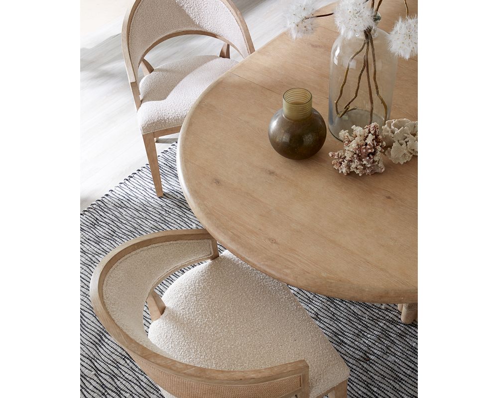 The Retreat Chair's upholstered seat and back are covered in Neo Cream performance fabric, ensuring comfort and durability. This fabric is easy to clean and maintain, making it ideal for everyday use. The back of the chair boasts raffia cane, adding texture and visual interest to the overall design.
