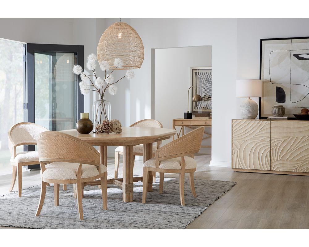 From Sofas and Sectionals.com: Retreat is crafted with flat-cut cathedral oak veneers and is characterized by two distinct finishes. Each finish is transparent by design to showcase the unique grain patterns of the veneer. Dune is light as sand and smooth as a shore after a receding tide. The second finish, Black Sand, was inspired by the black silk sands on the shorelines of the exotic beaches of Maui and Tahiti. Inspired by serene, tropical resort destinations that offer an escape from the pressures of modern life, Retreat is designed to help consumers replicate these peaceful and tranquil environments within their homes. The collection can be curated into two distinct personalities: Island Oasis and Modern Zen. Island Oasis intermingles both finishes, creating a tropical retreat-inspired vibe accentuated with organic details such as rope, cane, travertine, and woven accents.