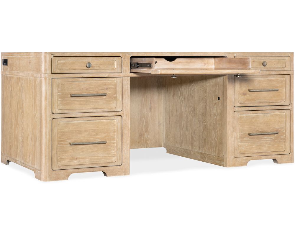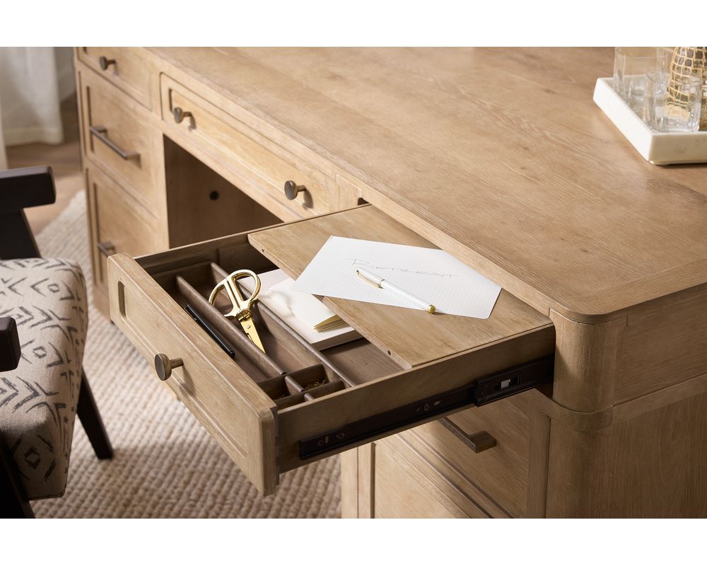 The Retreat Executive Desk is not just a pretty piece of furniture; it is designed to make your work easier and more efficient. The desk features seven spacious drawers, providing ample storage for all your office essentials. The left and right top drawers are equipped with two removable dividers, a pencil tray, and a writing slide that can be used on either side. The center drawer has a convenient drop-front, making it perfect for keyboard use.