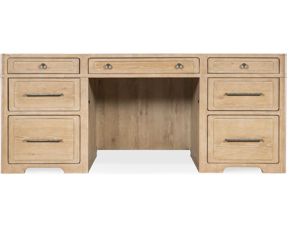 The Retreat Executive Desk is functional and boasts a serene and Zen vibe. The soft pewter round knobs and bar pulls add a touch of elegance to the overall design. Whether you're working from home or in a professional setting, this desk will create a peaceful and stylish atmosphere for you to work in.