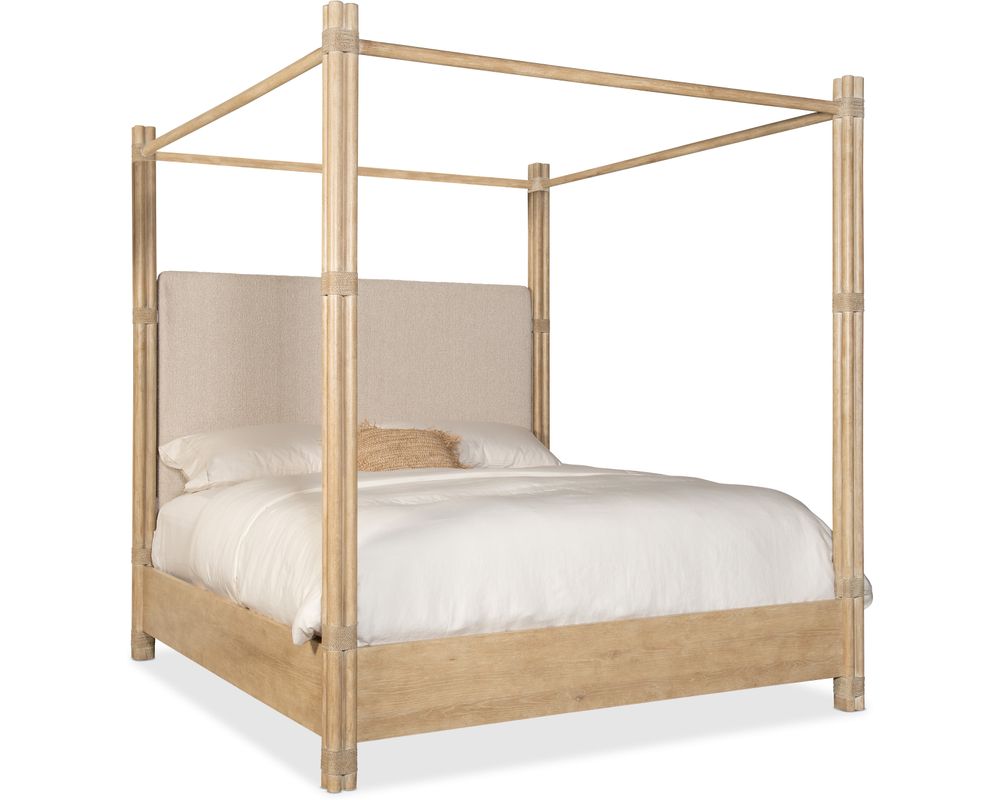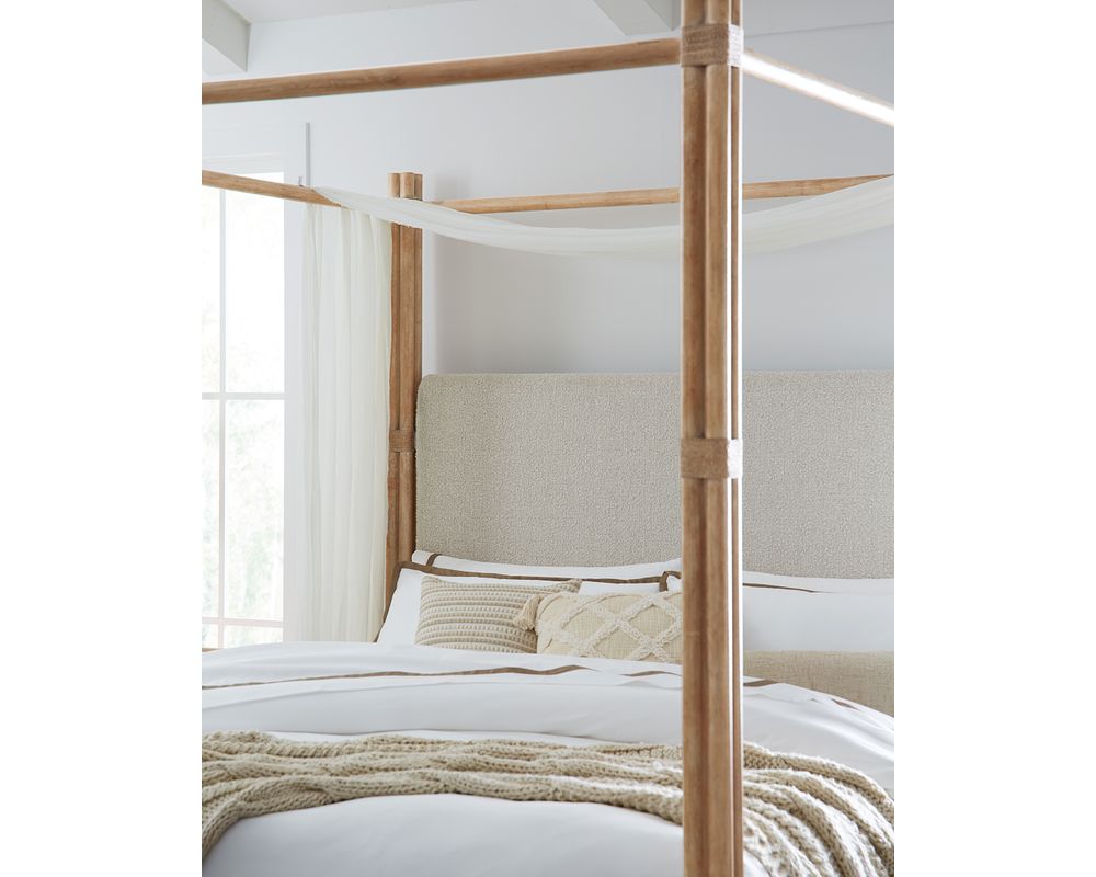 From Sofas and Sectionals.com: Experience the ultimate luxury and relaxation with the Retreat Pole Rattan Cal King Upholstered Poster Bed w/Canopy. This stunning bed features a unique design inspired by tropical getaways, with a dramatic bundled pole motif and elegant rope accents. The side rails are crafted from high-quality oak veneers and finished in a beautiful sand-colored dune, adding a natural charm to any bedroom.
