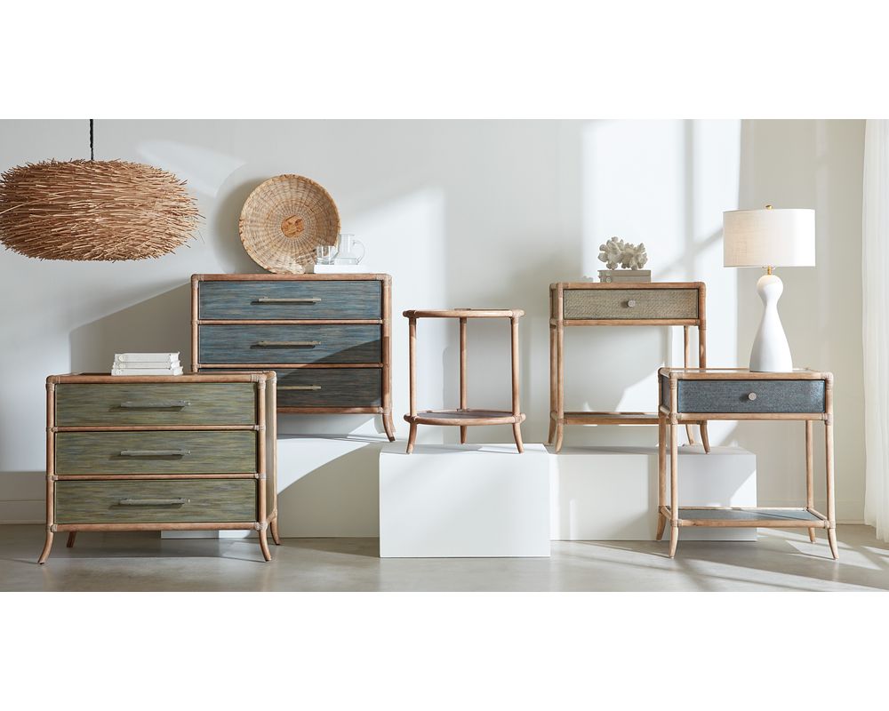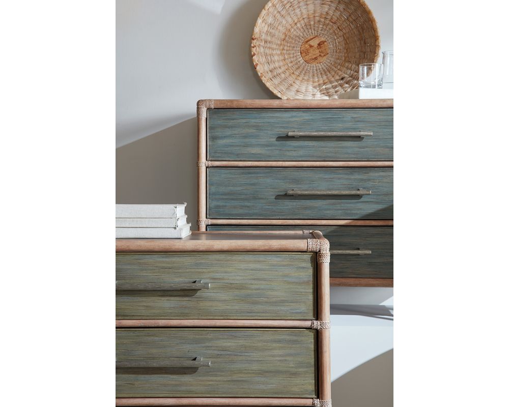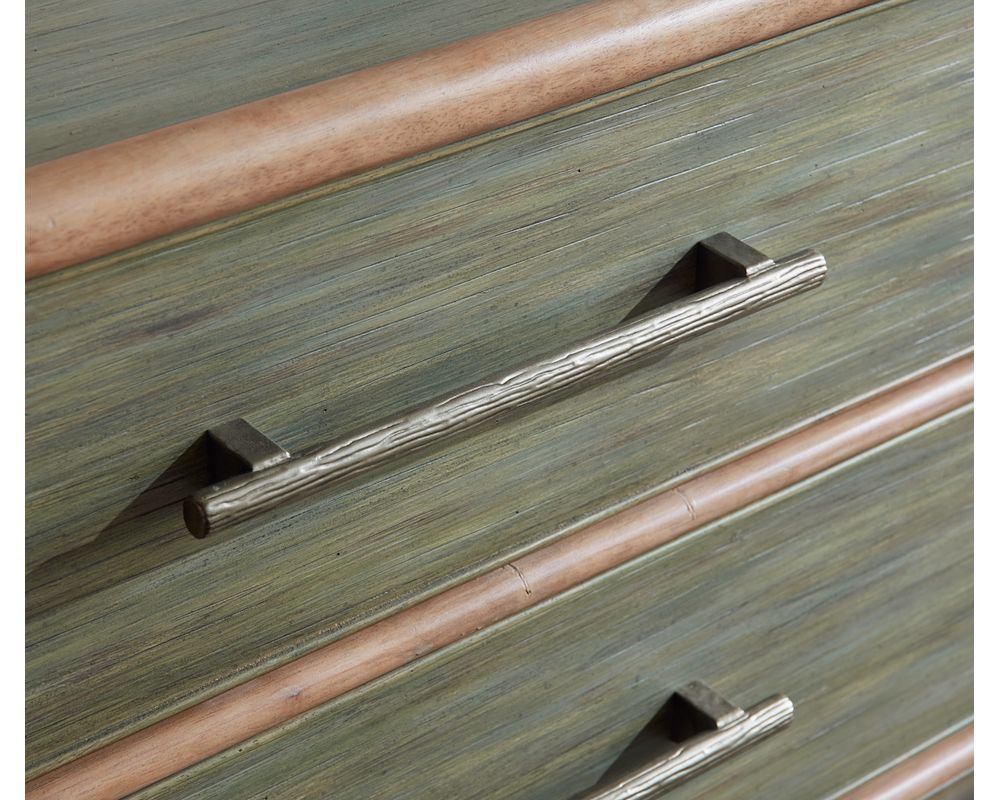 But that's not all. A few pops of accent finishes called Seagrass and Lagoon can be found on select pieces, enhancing the tropical mood of the collection. Modern Zen delivers a tranquil personality with a contemporary twist that showcases the Dune finish, enhanced with accent items in Black Sand. Several pieces incorporate woven cane, dramatic split bamboo-inspired accents, and Travertine stone. This collection is not just about style, it's about versatility. Highlights include a woven cane panel bed with clean, modern lines and various case pieces featuring geometric patterns and spa-inspired accents. Upholstered stationary and accent seating – available in sage and caramel tone leathers – complete the Zen narrative. Adding the finishing touch, the collection’s hardware is custom-designed to match each personality. Look for reed-inspired designs in Island Oasis and gently textured designs in Modern Zen. Both hardware options are featured in a soft pewter-plated finish.