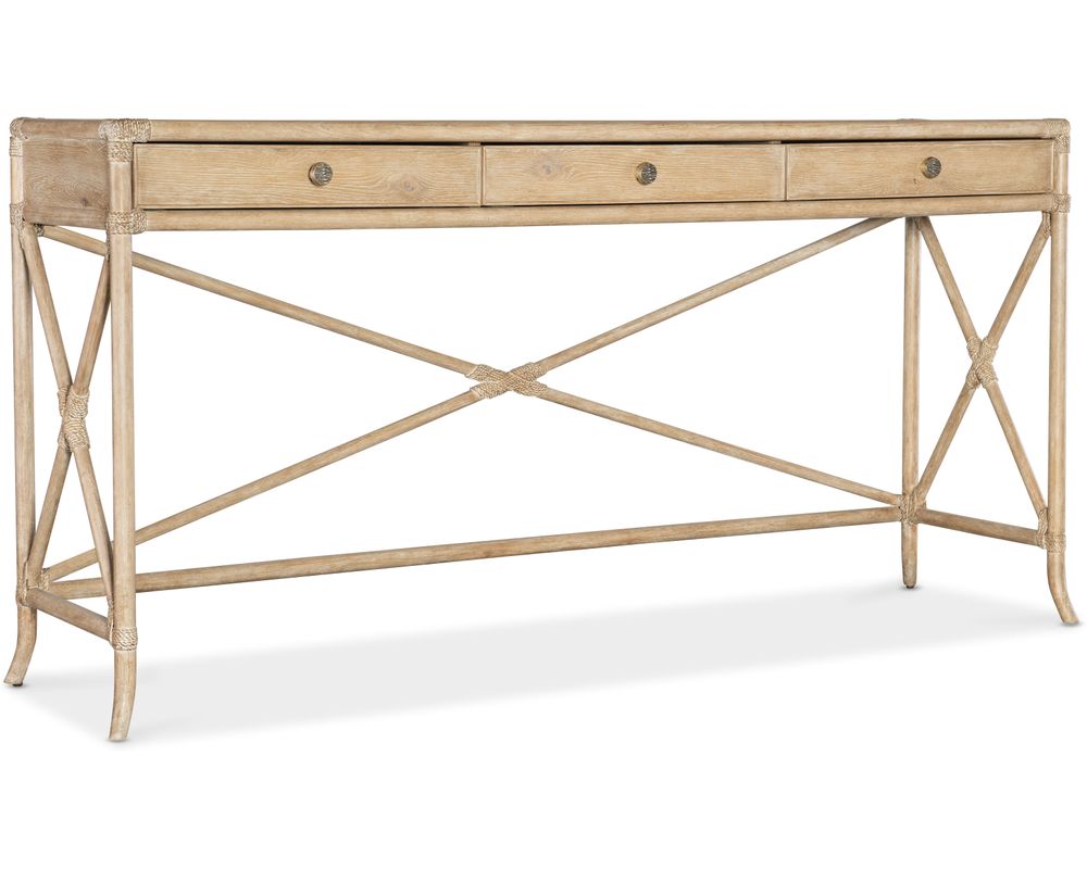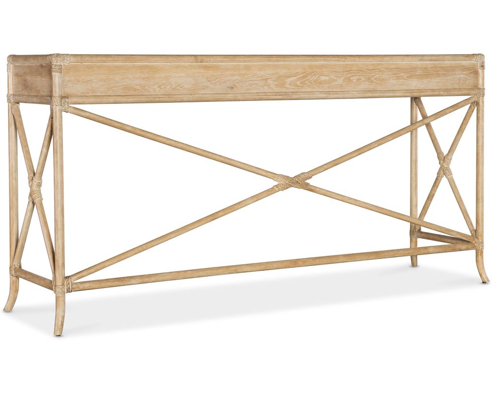 From Sofas and Sectionals.com: Add a touch of tropical elegance to your home with the Retreat Pole Rattan Console Table. This stunning piece is crafted with a Bamboo motif and accented by rope, giving it a sublime island oasis vibe. Made with high-quality Oak and Maple Veneers, this console table is visually appealing but also durable and long-lasting.