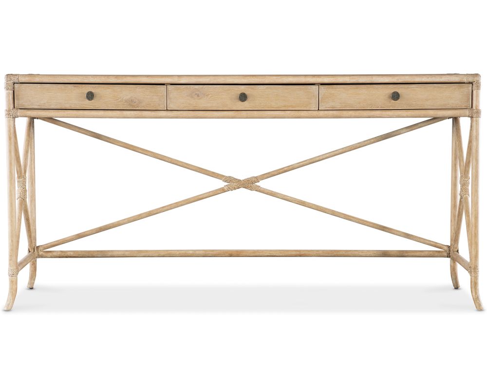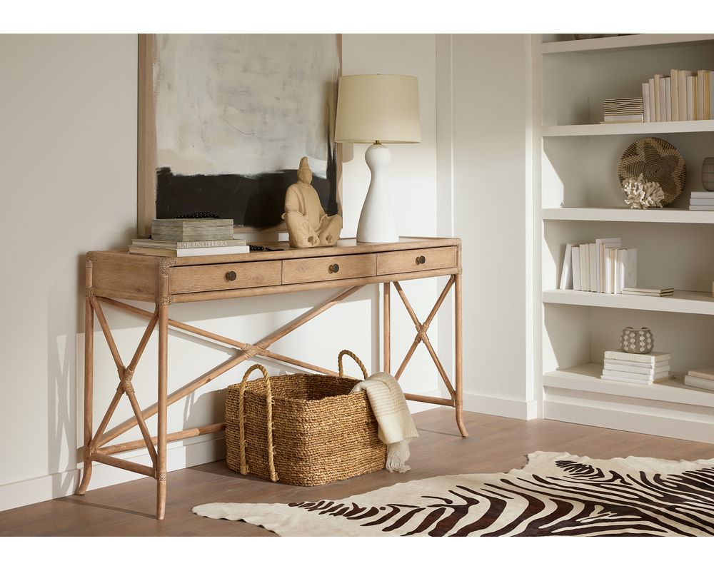 The X-design stretchers on the back and sides of the console table add a unique touch while also providing extra stability. The sand-colored Dune finish not only complements the natural look of the rattan but is also transparent by design to showcase the beautiful patterns of the wood veneer. This attention to detail truly sets this console table apart from others.
