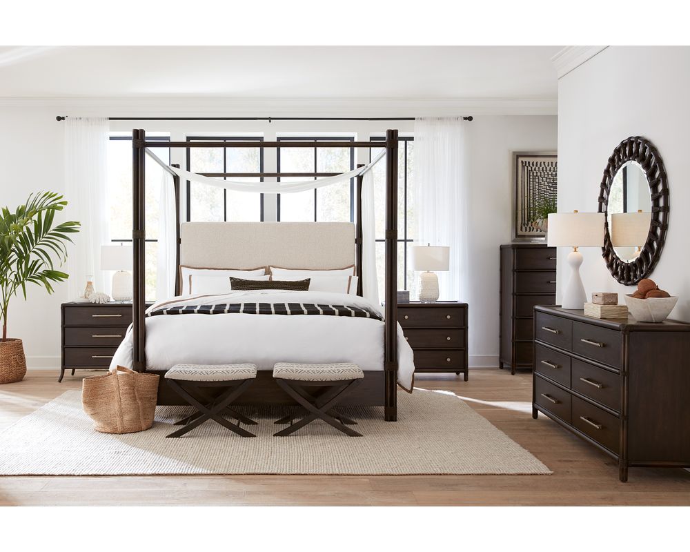But that's not all. A few pops of accent finishes called Seagrass and Lagoon can be found on select pieces, enhancing the tropical mood of the collection. Modern Zen delivers a tranquil personality with a contemporary twist that showcases the Dune finish, enhanced with accent items in Black Sand. Several pieces incorporate woven cane, dramatic split bamboo-inspired accents, and Travertine stone. This collection is not just about style, it's about versatility. Highlights include a woven cane panel bed with clean, modern lines and various case pieces featuring geometric patterns and spa-inspired accents. Upholstered stationary and accent seating – available in sage and caramel tone leathers – complete the Zen narrative. Adding the finishing touch, the collection’s hardware is custom-designed to match each personality. Look for reed-inspired designs in Island Oasis and gently textured designs in Modern Zen. Both hardware options are featured in a soft pewter-plated finish.