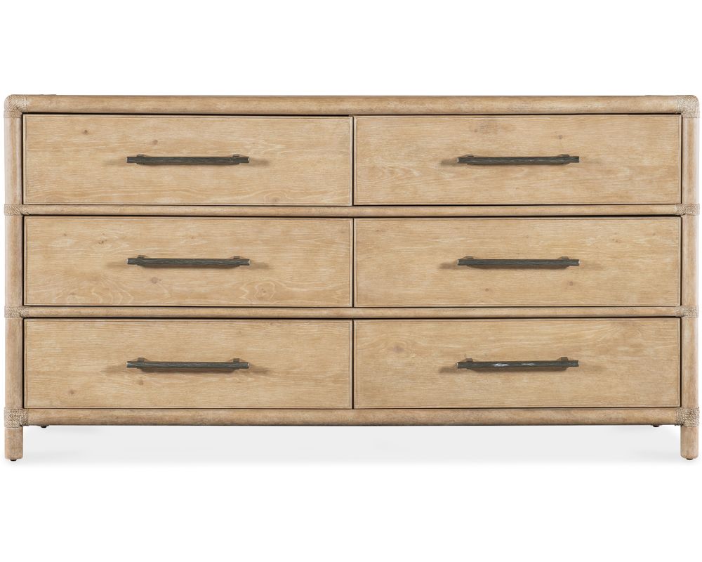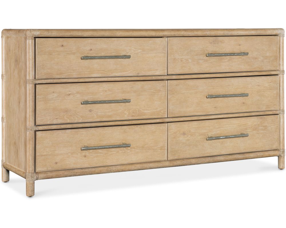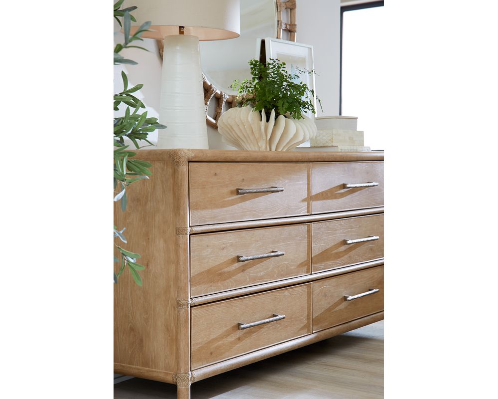 From Sofas and Sectionals.com: Take a piece of the tropical paradise home with the Retreat Pole Rattan Dresser. This stunning piece of furniture perfectly blends natural materials and versatile design, making it a must-have for any home. Crafted with oak, maple veneers, and Rope accents, this dresser exudes a relaxed and laid-back vibe.