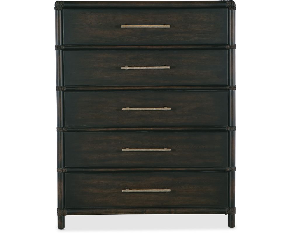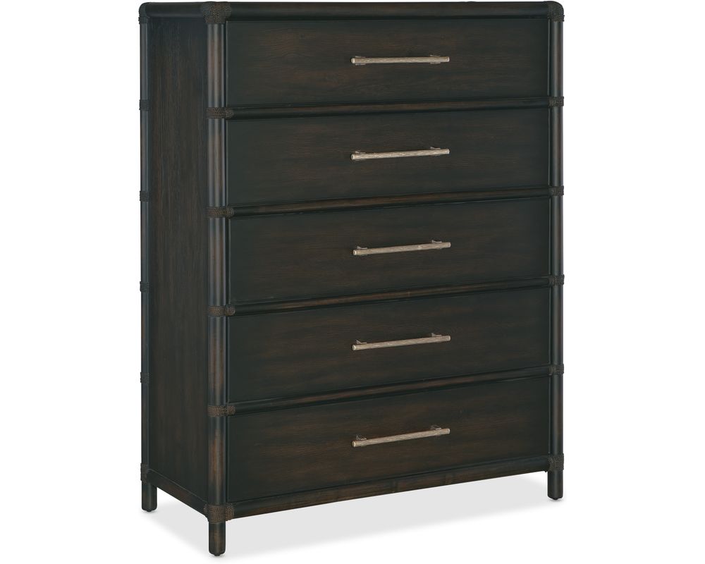 Adding to its natural appeal, the Retreat Pole Rattan Five-Drawer Chest is adorned with rope accents and textured, pewter-colored bar pulls. These elegant details enhance the chest's overall aesthetic, making it a statement piece in any space.