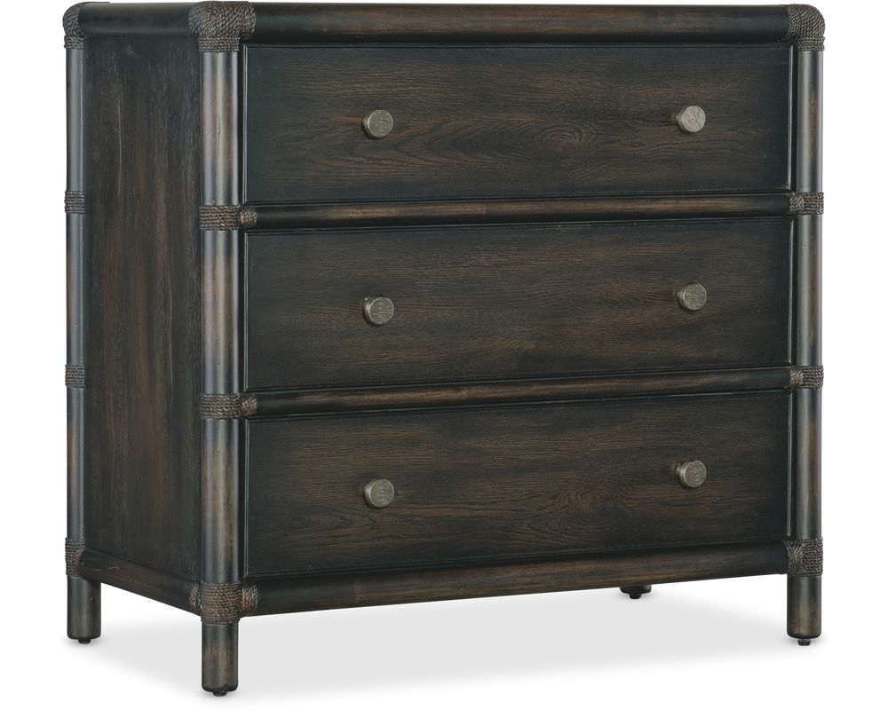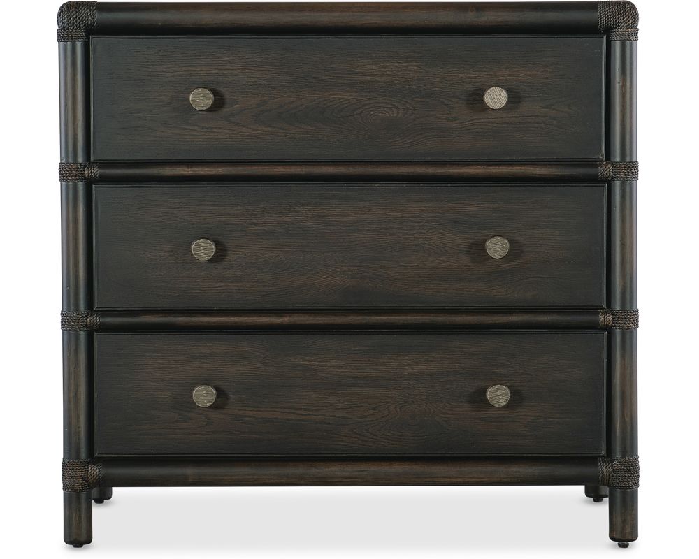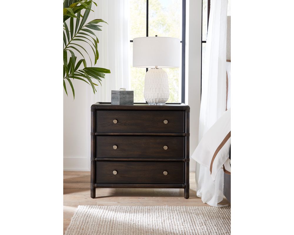 From Sofas and Sectionals.com: Introducing the Retreat Pole Rattan Nightstand, the perfect addition to your tropical-inspired bedroom. Made from a combination of high-quality Oak and Maple Veneers, this nightstand boasts a unique and laid-back design that will bring a touch of relaxation to your space. The combination of materials and finishes, including Rope accents and a transparent black sand finish, provides a natural and rustic feel that is perfect for creating a cozy and inviting atmosphere in your room.