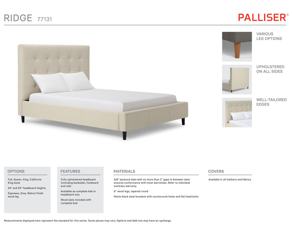 The complete bed set includes a headboard, footboard, rails, and sturdy wood slats, providing everything you need for a comfortable and stylish sleeping experience. The Ridge bed is also available in a California king-size.