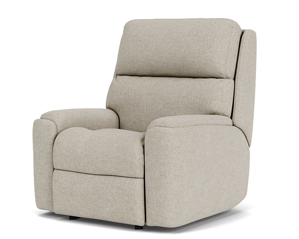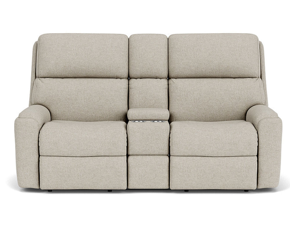 Whether you're watching a movie or gearing up for gaming, the Rio Reclining Loveseat with Console keeps you comfy and puts items like remotes and beverages close at hand. The spacious center console includes storage for glasses, magazines, and other personal items, along with two cup holders. Using an easy-access parachute release on either arm, you can seamlessly transition from sitting to reclining. Designed to keep you comfy for hours, Rio has divided back cushions that support your back from neck to lower lumbar. Inset padded armrests have a refined look and take pressure off your forearms, no matter how long you're lounging. Our patented Flexsteel DualFlex Spring System™ provides firmness and flexibility and ensures structural durability, even if things get rowdy. Includes dual power recliners with power headrests and USB charging ports. Features: