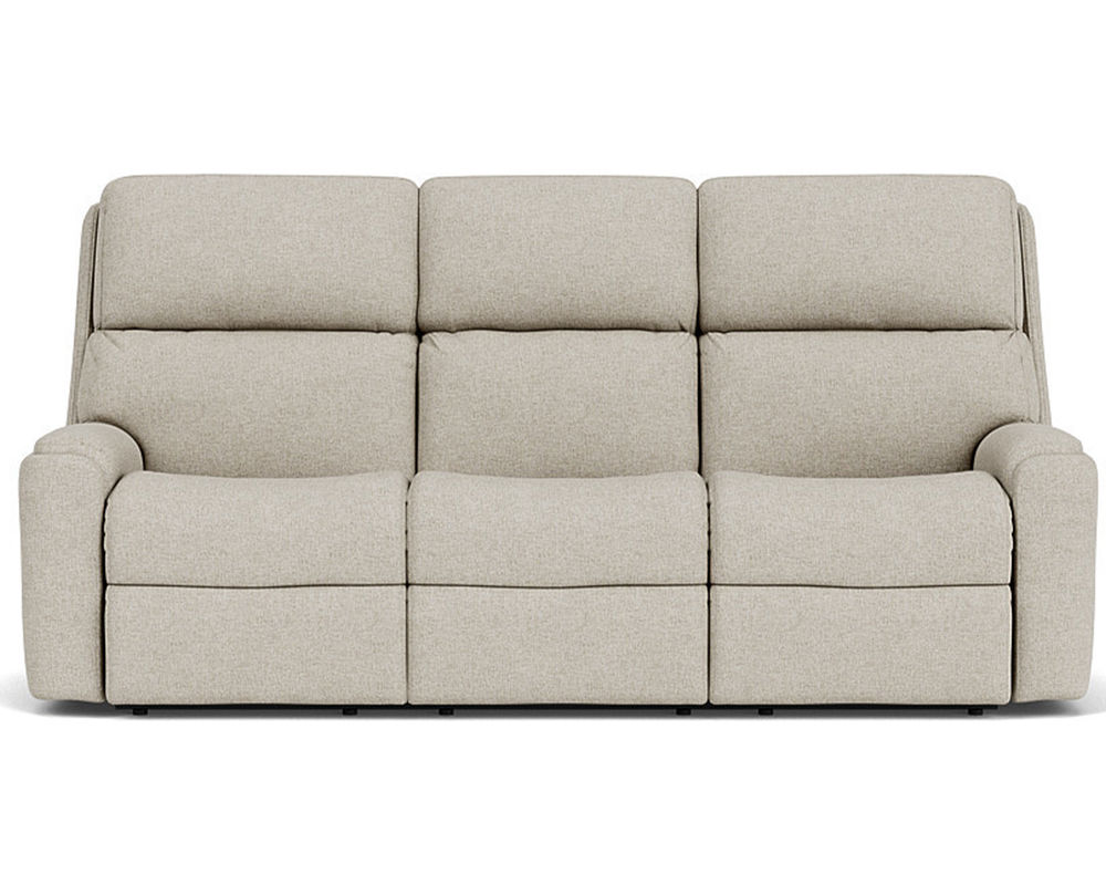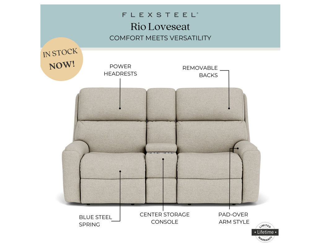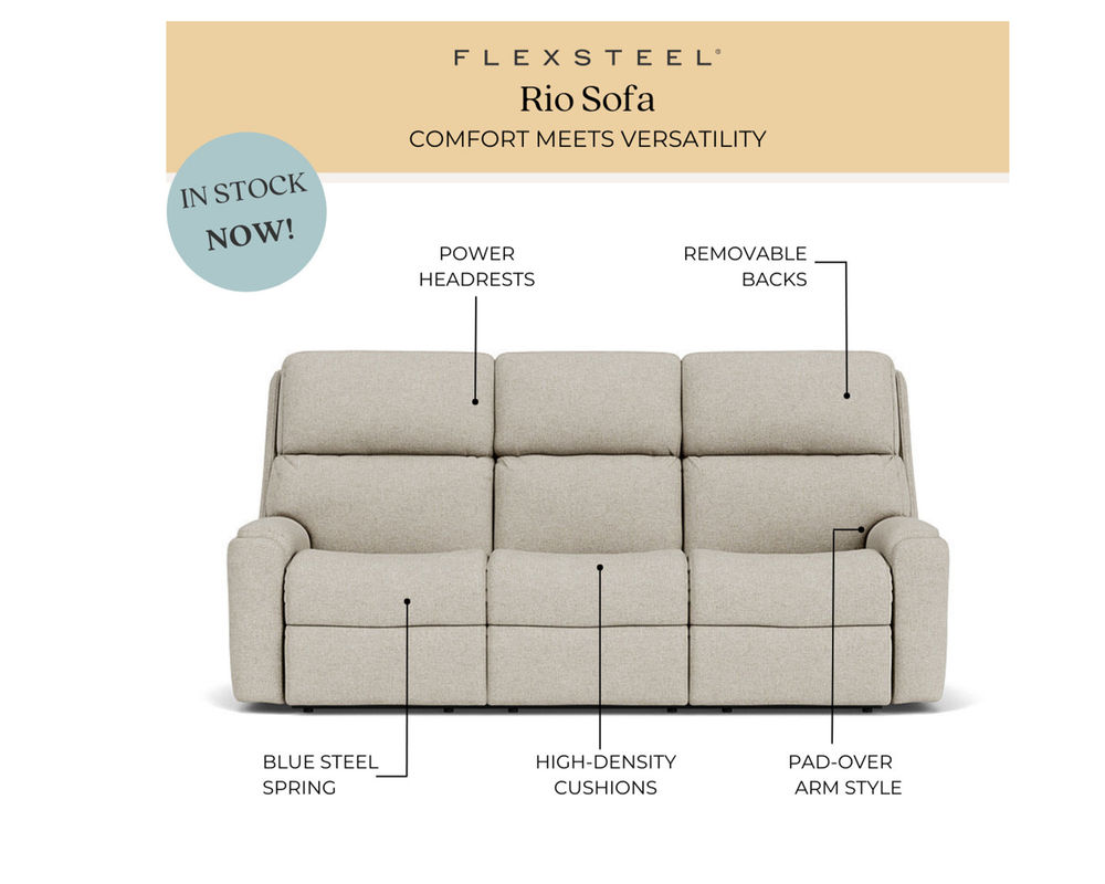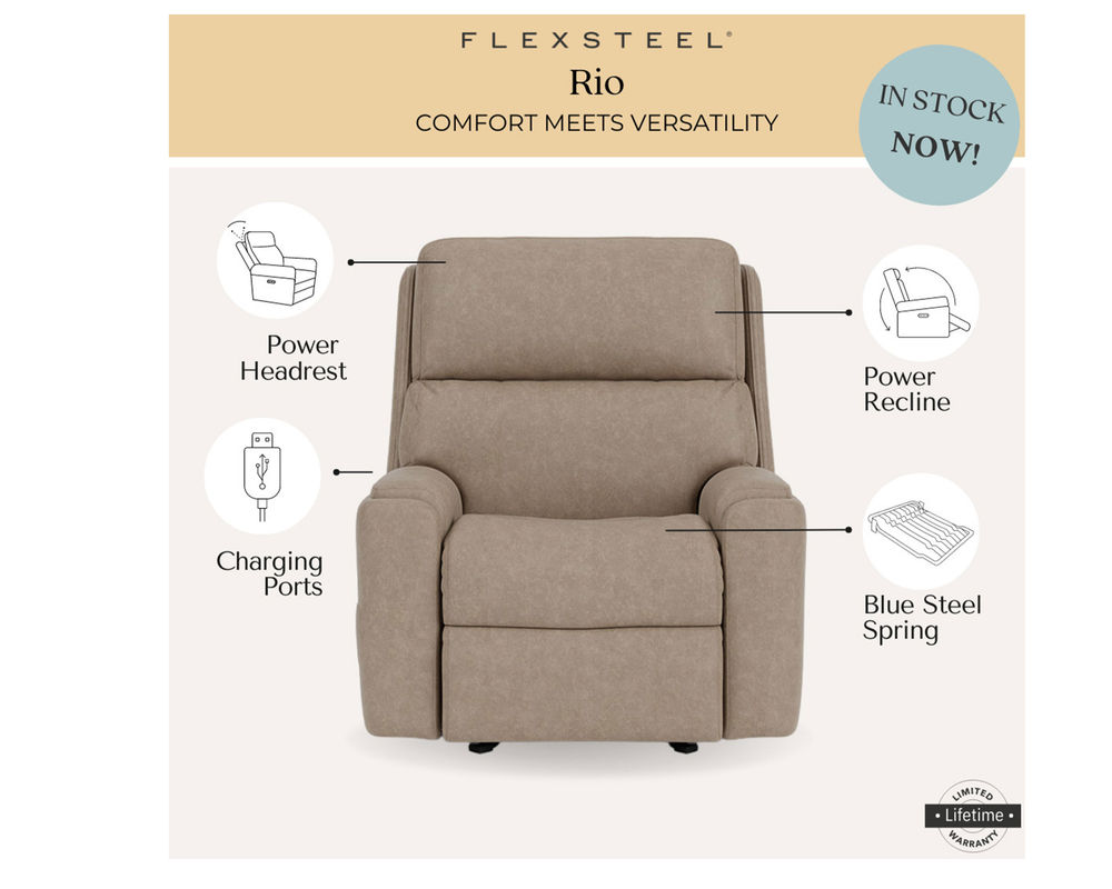 The Rio Recliner is designed to provide you with the ultimate comfort and relaxation. With an easy-to-access handle on the arm, you can easily adjust the recline to suit your needs. The recliner features divided back cushions that provide support to your neck, back, and lower lumbar, as well as inset padded armrests that take pressure off your forearms. The Rio Recliner is reinforced by our patented Flexsteel DualFlex Spring System™ that combines firmness with flexibility, making it built to last. With the Rio Recliner, you can prioritize your comfort and well-being. Power recline and power recline with power headrest options are available. Includes power headrest and power recline with USB charging port.