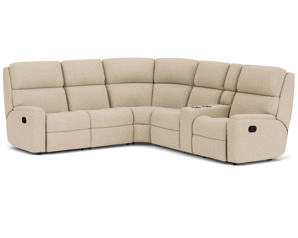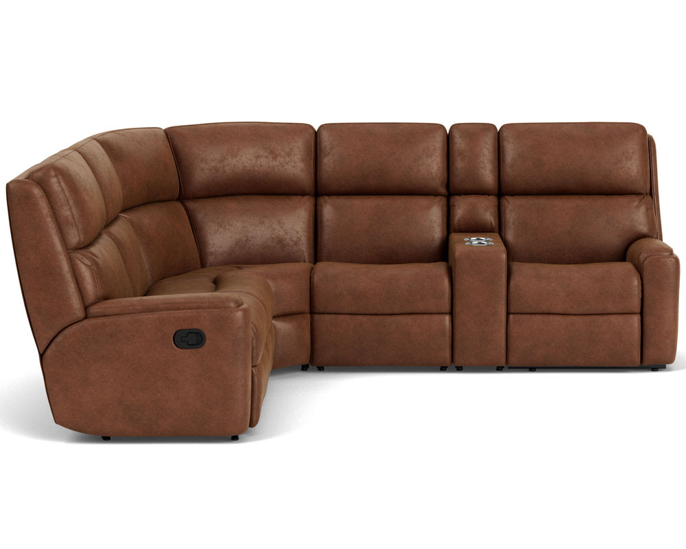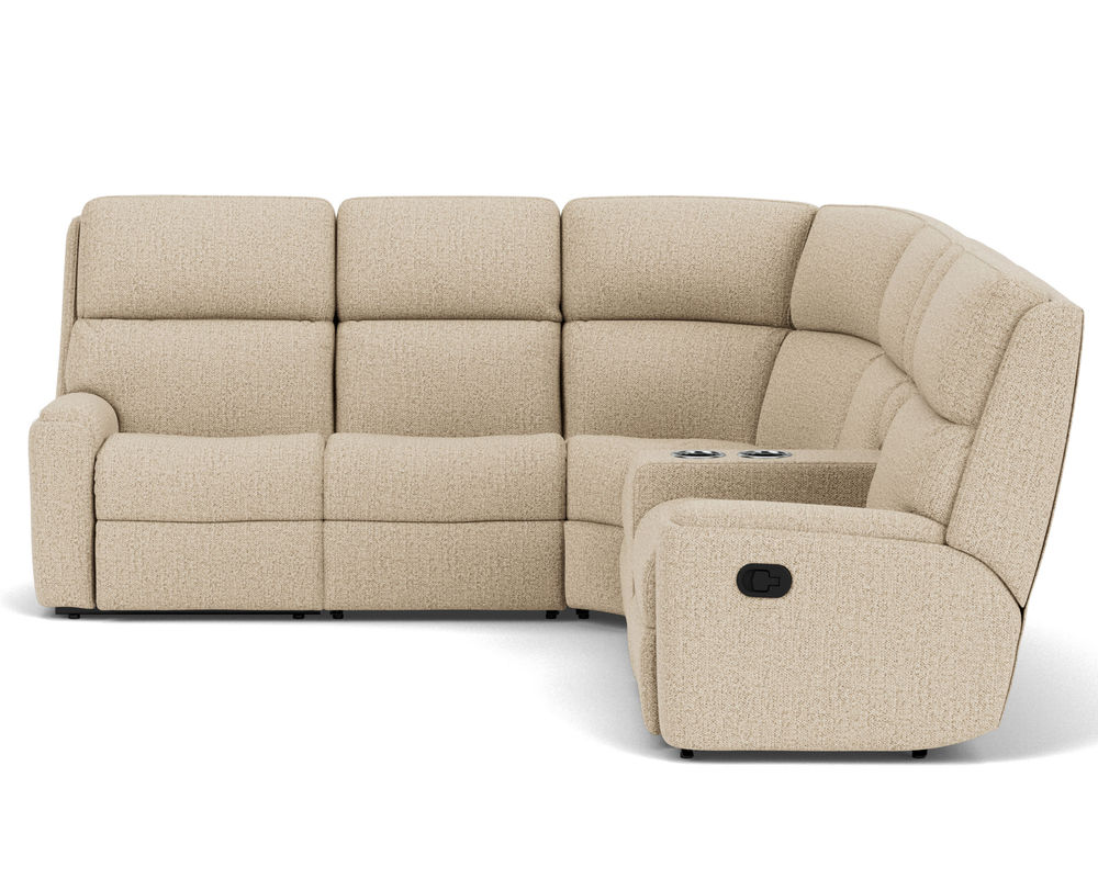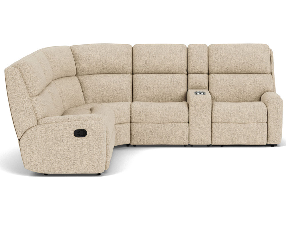 The Rio Reclining Sectional is the perfect choice for creating a relaxing evening at home. The sectional is upholstered in a durable fabric and features an easy-to-use parachute release for adjusting the footrests and recline. It also has a convenient storage console, so you never have to worry about misplacing the remote. The simple design has a contemporary aesthetic with plush divided back cushions that provide neck-to-lower-lumbar support. The inset padded armrests have a refined look and take the pressure off tired forearms. Our patented Flexsteel DualFlex Spring Systemâ„¢ ensures years of flexibility and firmness as you sit. With over 250 fabric options to choose from, including highly durable, cleanable high-performance textiles, you can select the perfect sectional to complement your home.