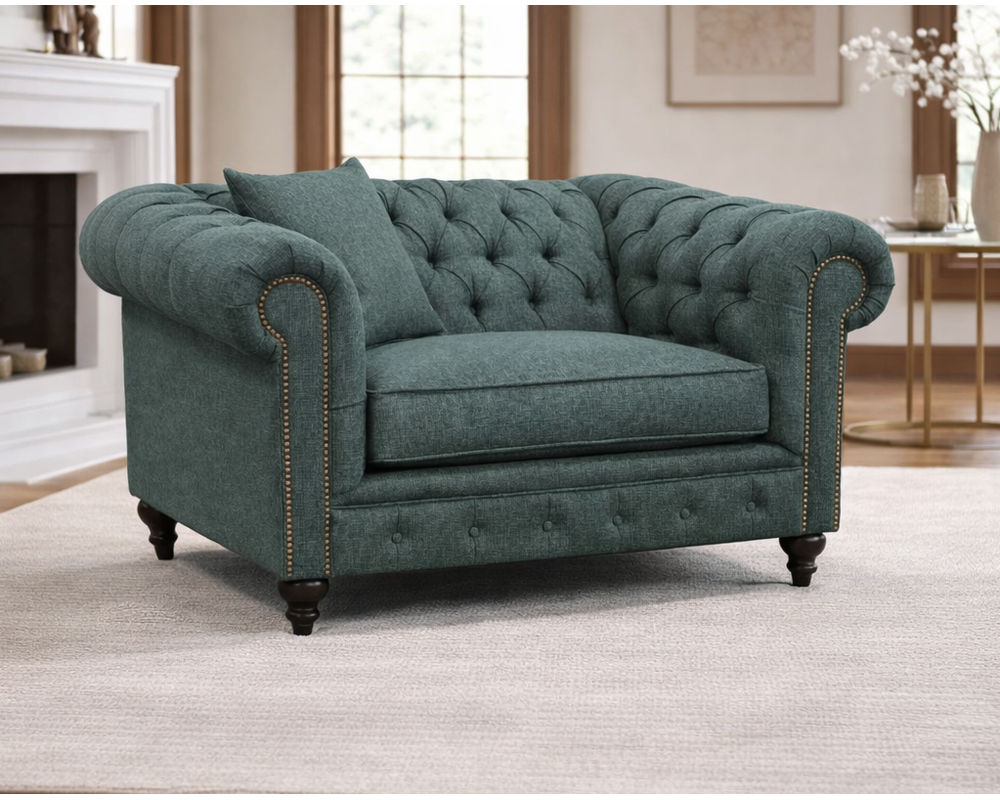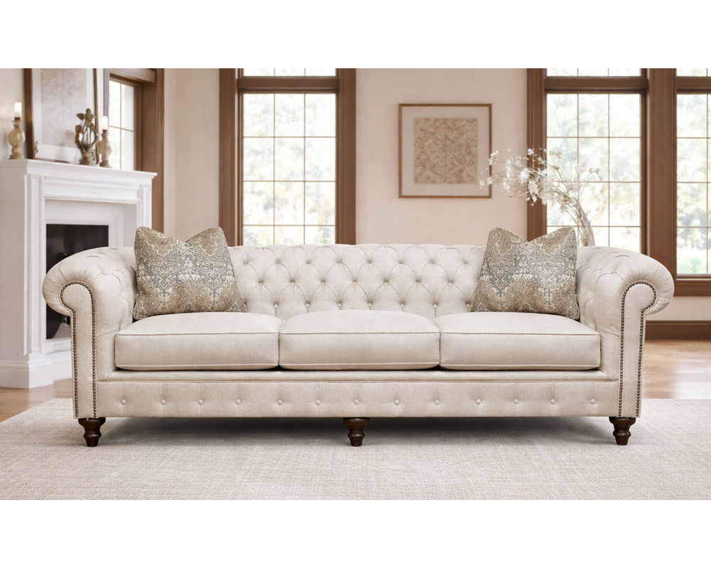 ■ Classic Chesterfield Design – Inspired by the iconic English Chesterfield with deep button tufting and rolled shelter arms.