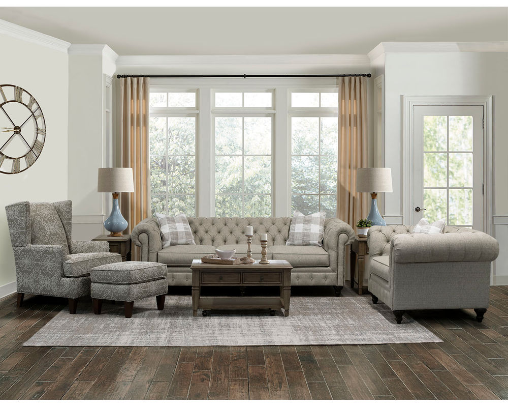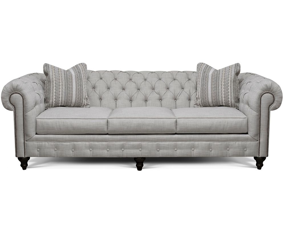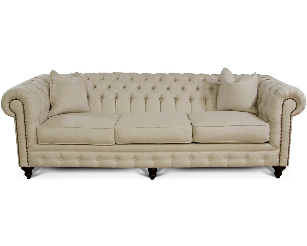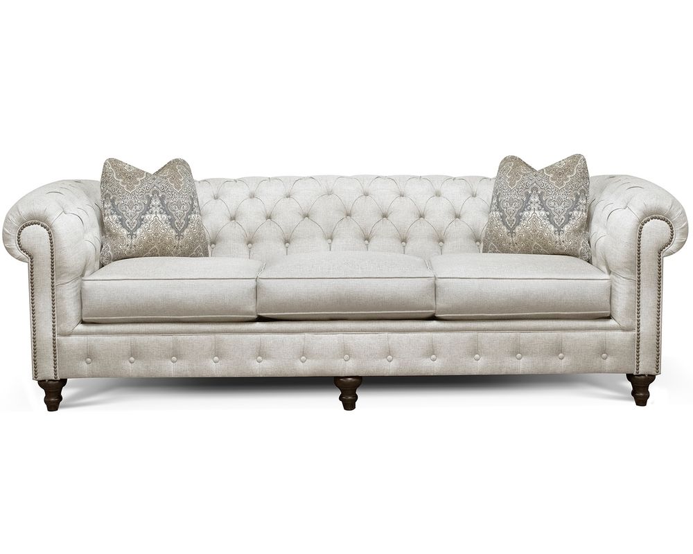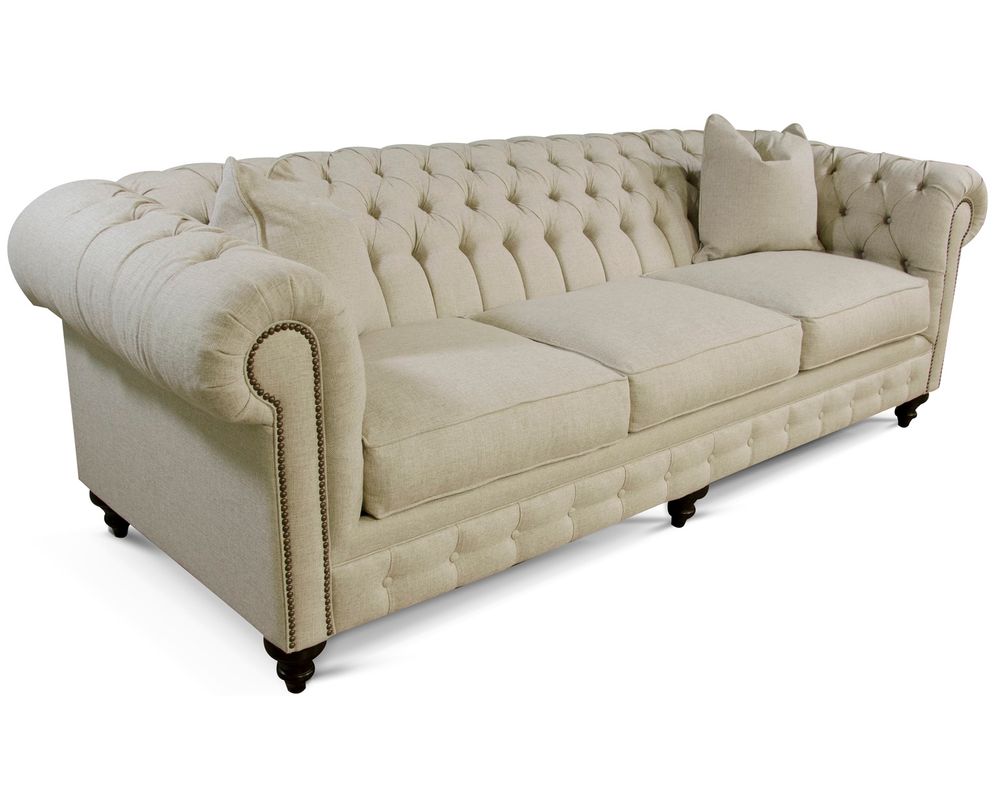 The Rondell 99" Sofa from England Furniture is a refined interpretation of the iconic English Chesterfield, bringing timeless elegance and classic craftsmanship to your living space. With its beautifully tufted back and inside arms, graceful rolled shelter arms, and decorative button accents along the front rail, the Rondell sofa delivers a look that is both sophisticated and inviting.