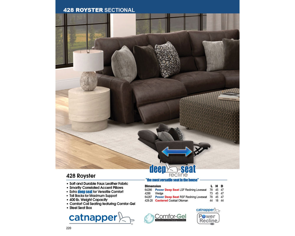Introducing the Royster 428 Reclining Sectional, the perfect addition to your living room for ultimate comfort and style. This sectional, designed with a casual style, is not just a piece of furniture, but a versatile choice that can seamlessly blend into any home decor. The soft and durable faux leather fabric adds a touch of elegance while also ensuring long-lasting use.