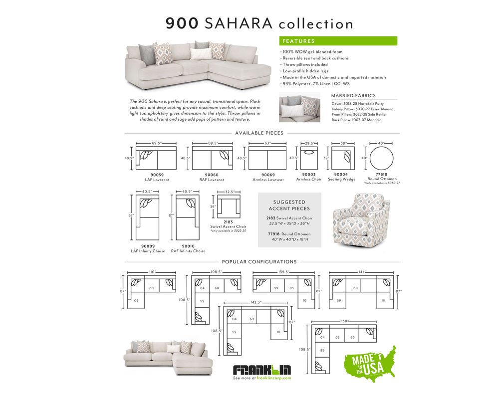 The 900 Sahara is perfect for any casual, transitional space. Plush cushions and deep seating provide maximum comfort, while warm light tan upholstery gives dimension to the style. Throw pillows in shades of tan and sage add pops of pattern and texture.
