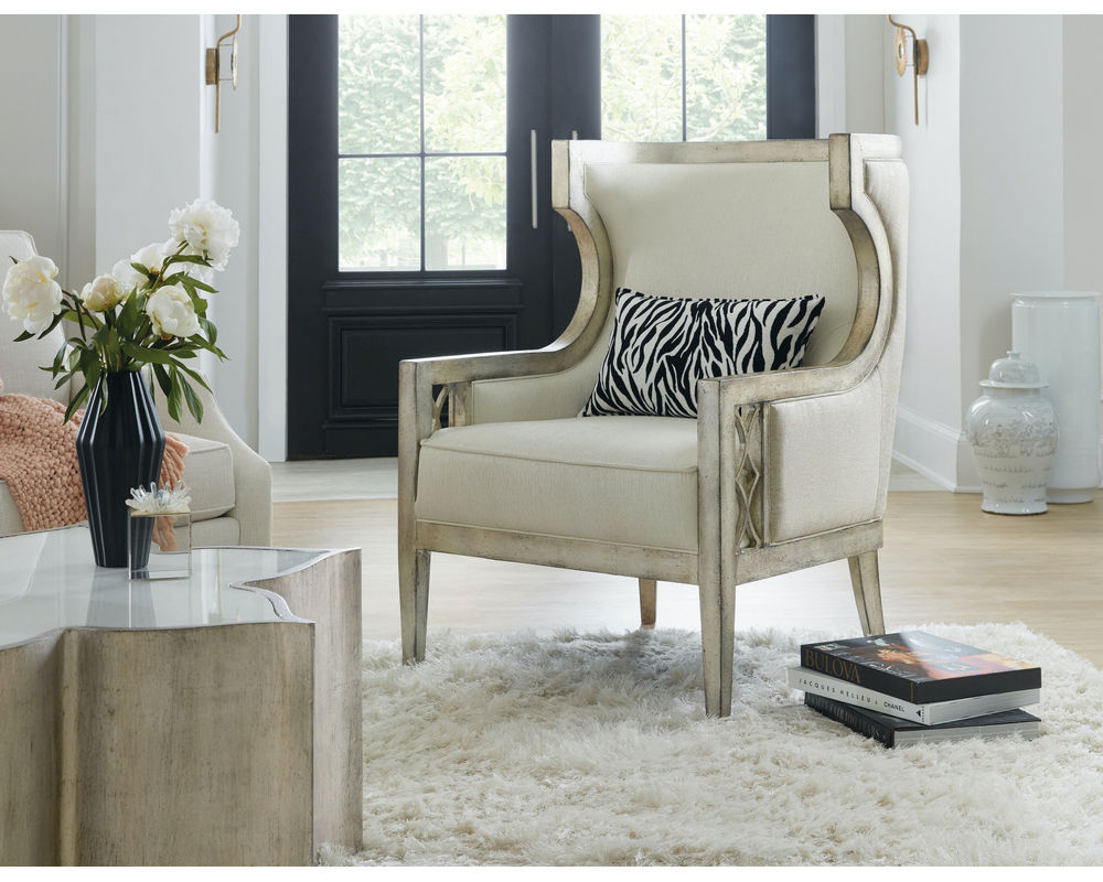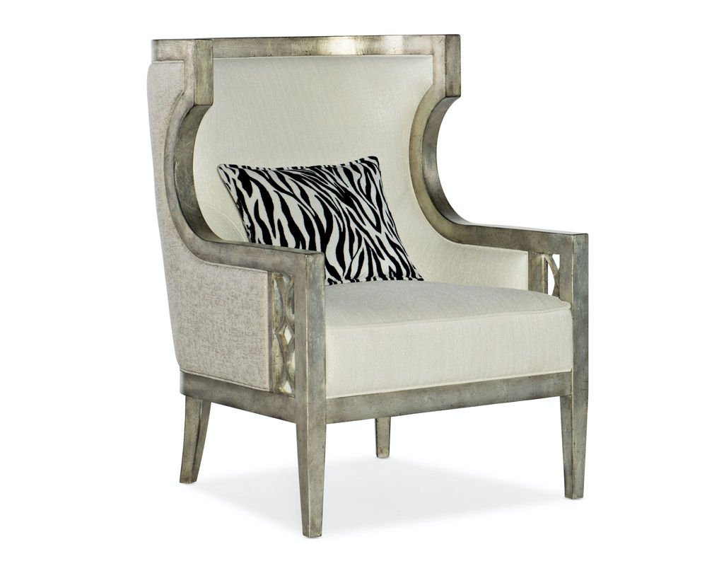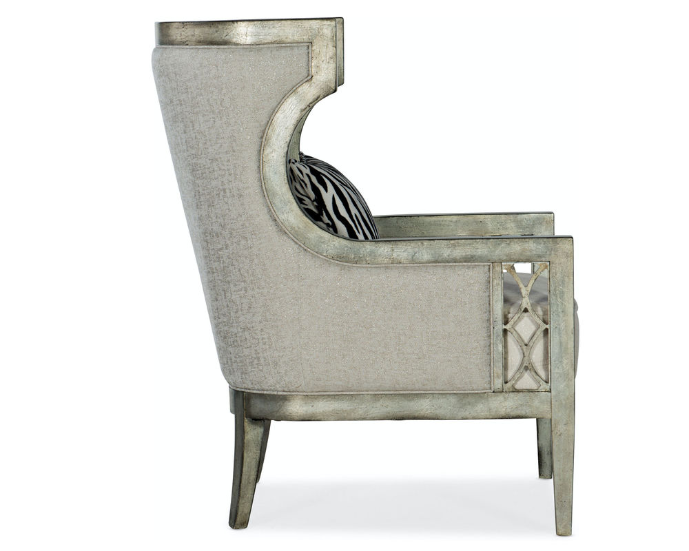 She's a modern gal: up to date and sumptuously scaled. The Sanctuary Debutant Wing Chair has a classic pedigree in historic traditional and has been streamlined and modernized. A true style statement, the Debutant shows off three different performance fabrics: The inside back and seat is in Celestial Ice, and the outside back is in Sequins Pearl, while the pillow is in a zebra print for extra fun.