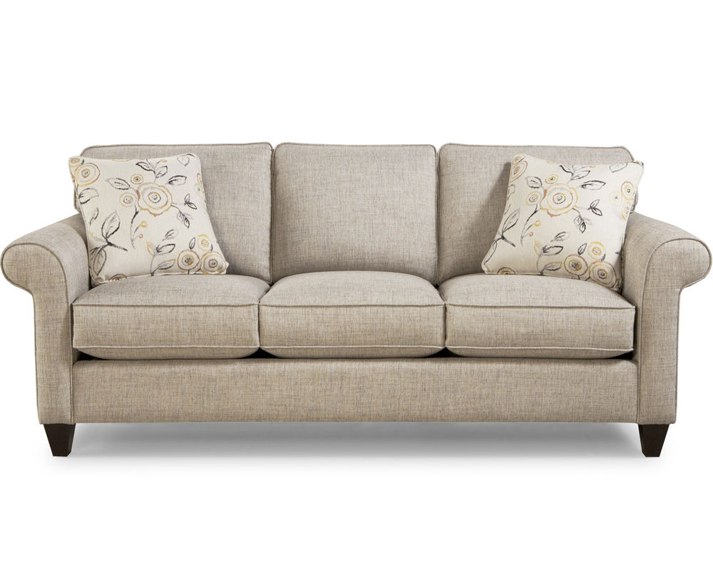This elegant and inviting Sandra 7421 Sofa is perfect for anyone looking for classic styling with modern updates. It features a three-seat configuration with semi-attached box border backs and simple rolled arms, all covered in a soft fabric upholstery. The modern tapered legs give it an updated look that's perfect for today's casual lifestyles. As an added bonus, this sofa is also available as a Queen size sleeper sofa, so you can easily accommodate overnight guests. To complete the look, there's also a matching loveseat, chair, and ottoman available. With its timeless style and modern updates, the Sandra 7421 Sofa is sure to be a customer favorite.