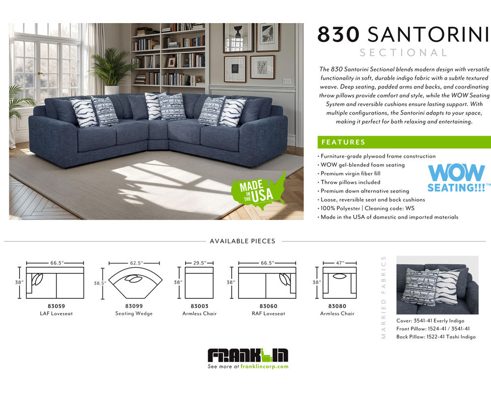Built with Franklin’s exclusive WOW Seating System, the Santorini 830 Sectional features precision-cut, furniture-grade plywood frames paired with gel-blended foam seating for lasting comfort and support. Loose, reversible seat and back cushions are designed to be flipped, helping promote even wear and extend the life of your sectional. Thoughtfully crafted and effortlessly stylish, the Santorini delivers the perfect balance of comfort, durability, and everyday elegance.