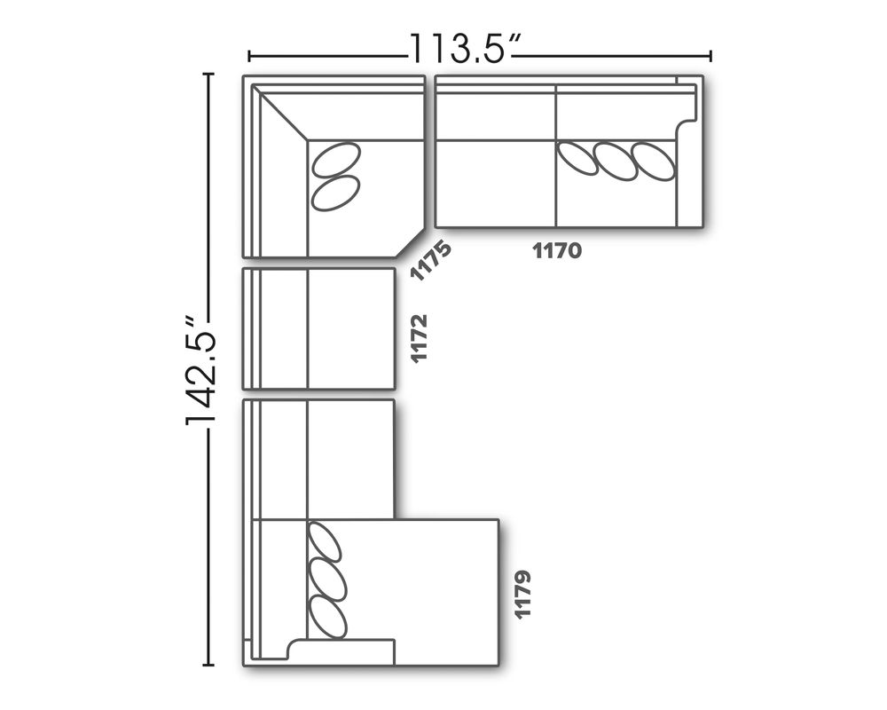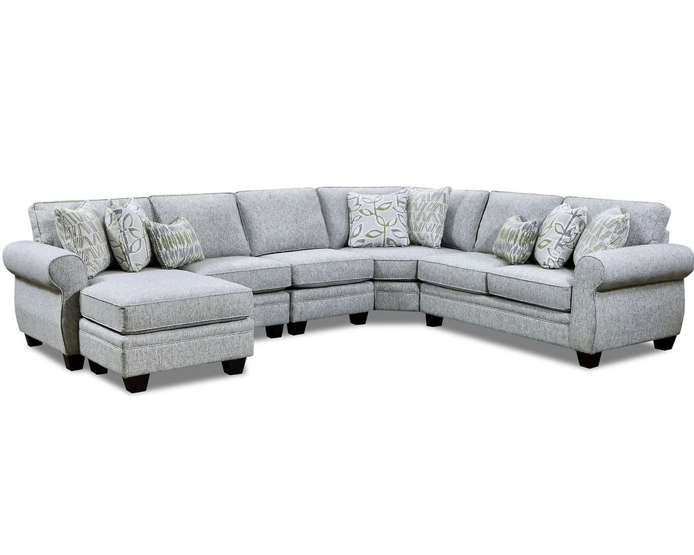 The Satisfaction Metal Sectional comprises of a Left Arm Facing One Arm Chaise Loveseat, a Right Arm Facing Loveseat an armless chair that can be moved to either side and a 90 degree corner. Satisfaction Metal has rounded arms, comes with eight different pillows in three different patterns which gives you flexibility to change the look and feel of your room simply by changing out your pillows. With the coffee finish legs and accent patterns used, Satisfaction Metal gives a casual, transitional, fun family room feel.