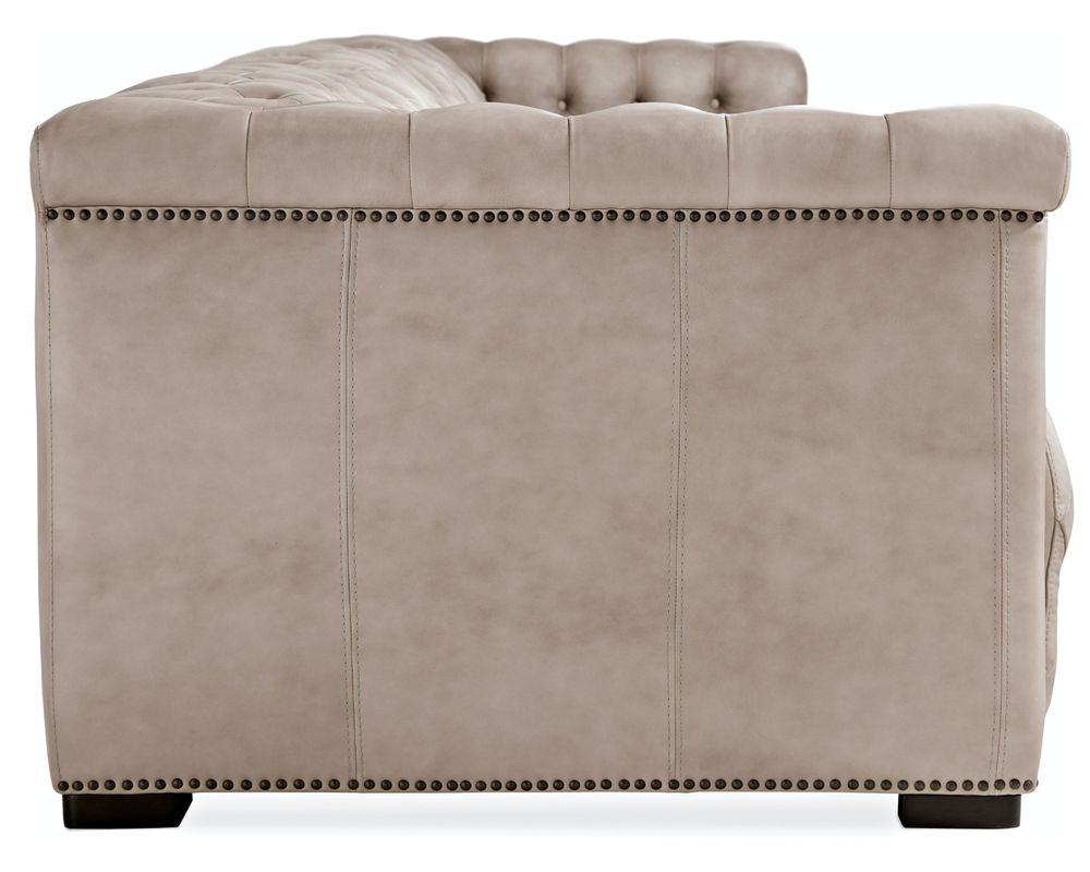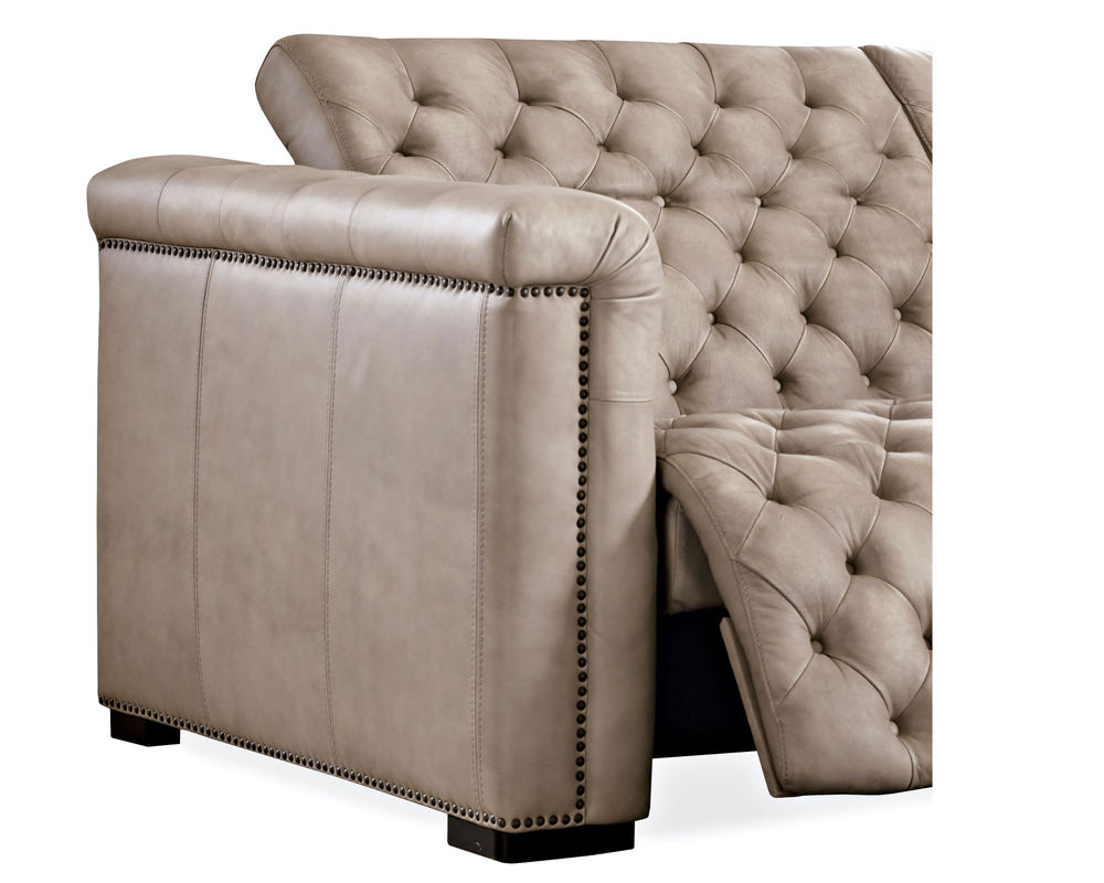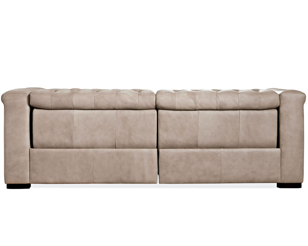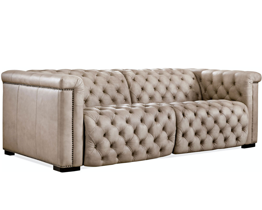 Inspire awe with your family and friends, who will never believe a sofa as stunning as the Savion has two power recliners, and that each of the 2 seats features an adjustable headrest. The individually operated headrests invite you to lean back and relax your upper body while watching TV, reading or conversing, and the seating units transform to recliners with a smooth power control button, offering exceptional comfort. Savion blends classic elegance with modern flair, combining traditional button-tufted tailoring with a sleek profile back. The hand-wiped l Giovanni Taupe leather cover is finished for stain protection and is hand wiped, offering authenticity and sophisticated appeal. Hooker Furniture Upholstery is a designer-inspired collection of upscale leather seating that includes versatile reclining chairs, modern-day reclining sofas, eclectic club and artisan accent chairs, as well as a selection of executive desk chairs for the home. Designed and curated to appeal to a variety of style tastes, each piece from Hooker Furniture Upholstery is meticulously crafted in a unique selection of textures and hues.