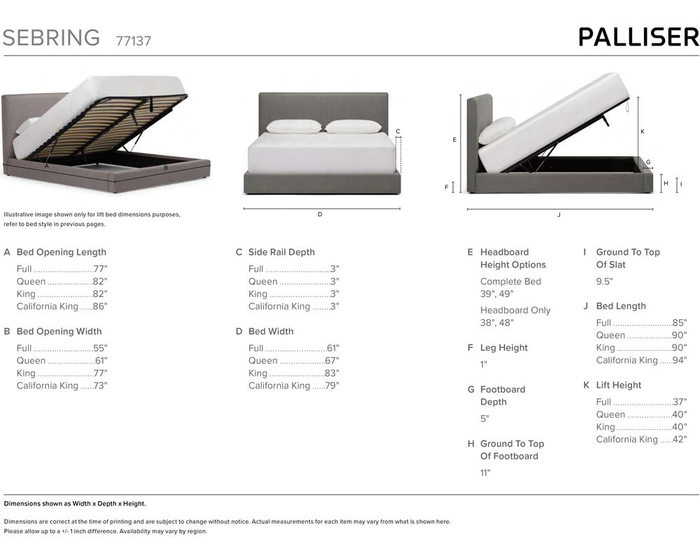 When you purchase the Sebring Lift Storage Bed, you will receive a complete set, including the headboard, footboard, rails, and wood slats. This option is also available for those who prefer a California king-size bed. Compared to a standard king-size bed, the bed is 4" longer and 3" shorter in width.