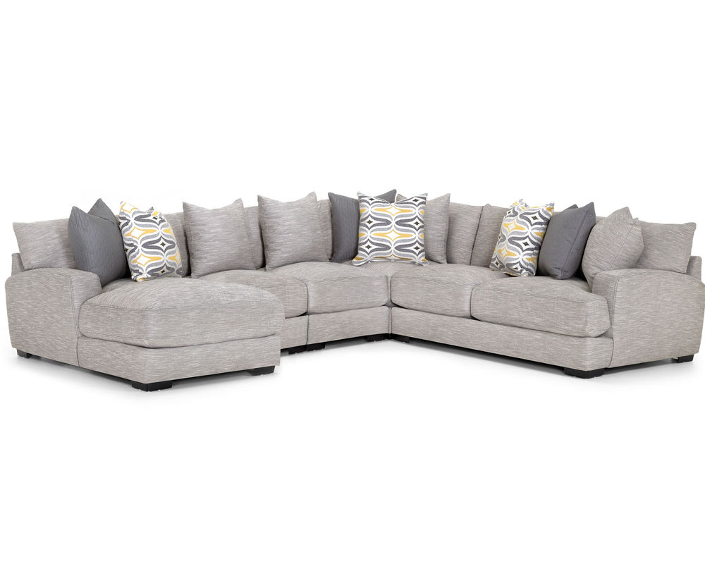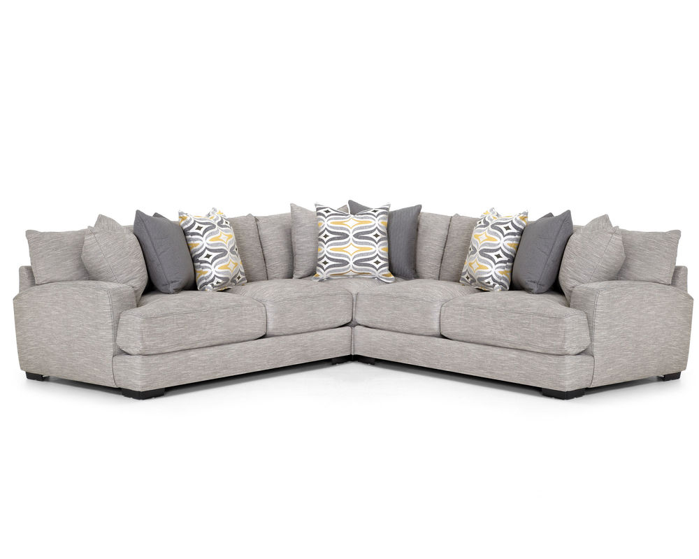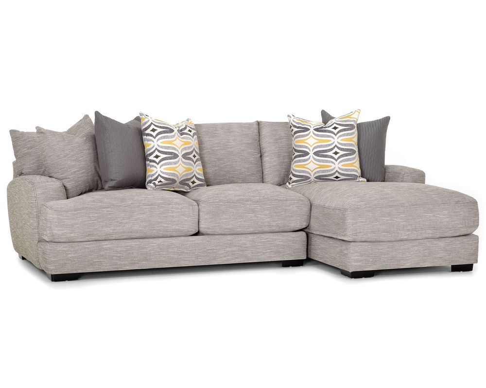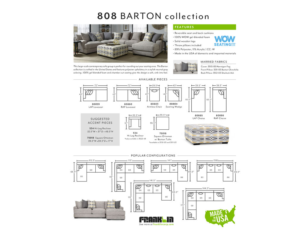 A contemporary sectional with casual appeal, Franklin's 808 Barton Sectional offers a cool color scheme with subtle sunny color pops found in the printed accent pillows. In contrast, the textured gray accent pillows add another layer of interest. The three-piece pale gray sectional employs track arms with loose seat cushions and backs, with reversible T-cushions for seating being a practical feature. A matching ottoman is also available. Extra-thick seat cushions are exclusive to the "Comfort Grid Seat Cushion," which enhances the seating experience and greatly extends cushion durability. Franklin's passion for their American-made product and obsession with quality is evident in their fine furnishings and willingness to stand behind their product with the best warranty in the industry, with a lifetime warranty on the reclining mechanism, all other metal parts, and wooden frame parts. This is possible because Franklin fabricates their own foam, stamps their reclining mechanisms, and cuts their wooden frames.