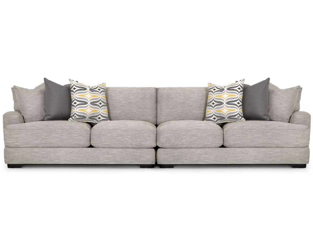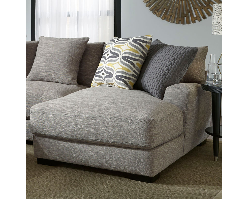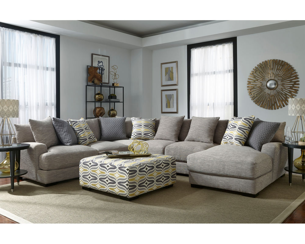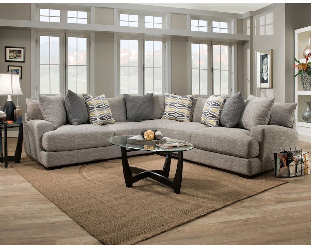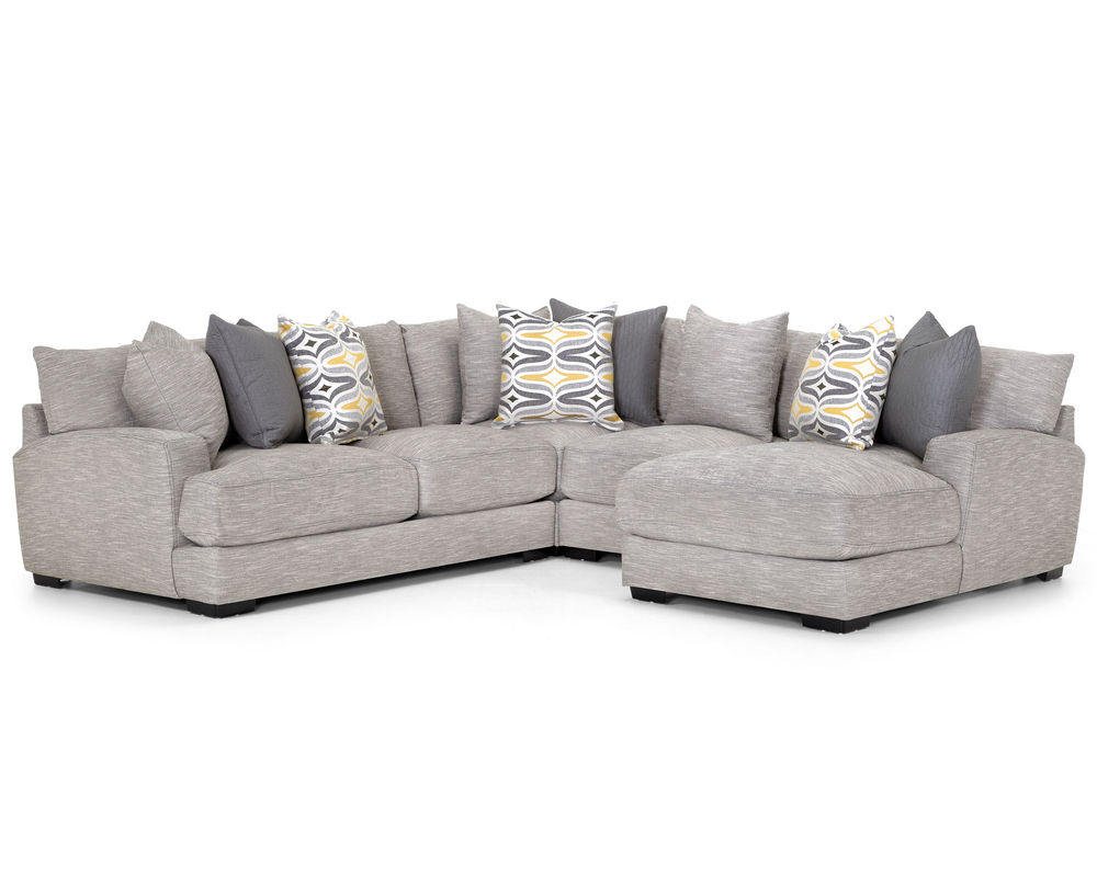 A contemporary sectional with casual appeal, Franklin's 808 Barton Sectional offers a cool color scheme with subtle sunny color pops found in the printed accent pillows. In contrast, the textured gray accent pillows add another layer of interest. The three-piece pale gray sectional employs track arms with loose seat cushions and backs, with reversible T-cushions for seating being a practical feature. A matching ottoman is also available. Extra-thick seat cushions are exclusive to the "Comfort Grid Seat Cushion," which enhances the seating experience and greatly extends cushion durability. Franklin's passion for their American-made product and obsession with quality is evident in their fine furnishings and willingness to stand behind their product with the best warranty in the industry, with a lifetime warranty on the reclining mechanism, all other metal parts, and wooden frame parts. This is possible because Franklin fabricates their own foam, stamps their reclining mechanisms, and cuts their wooden frames.