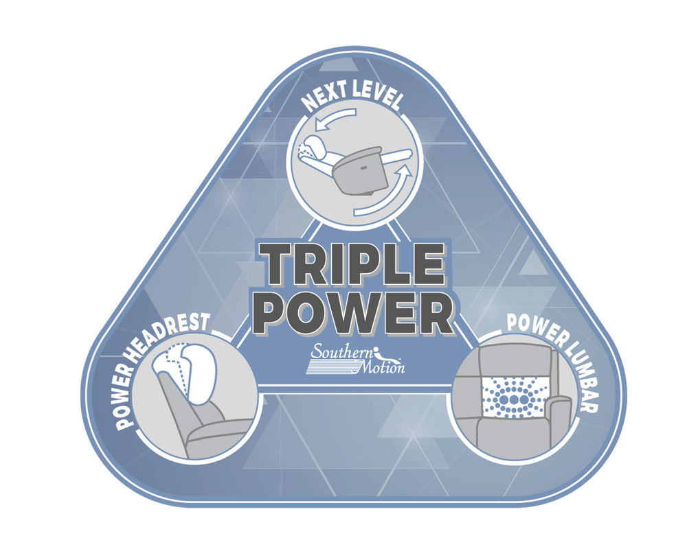 Triple Power Includes a Power Recline, Power Headrest, and Adjustable Power Lumbar Support with USB charging ports.