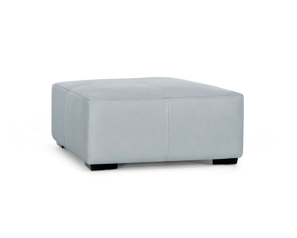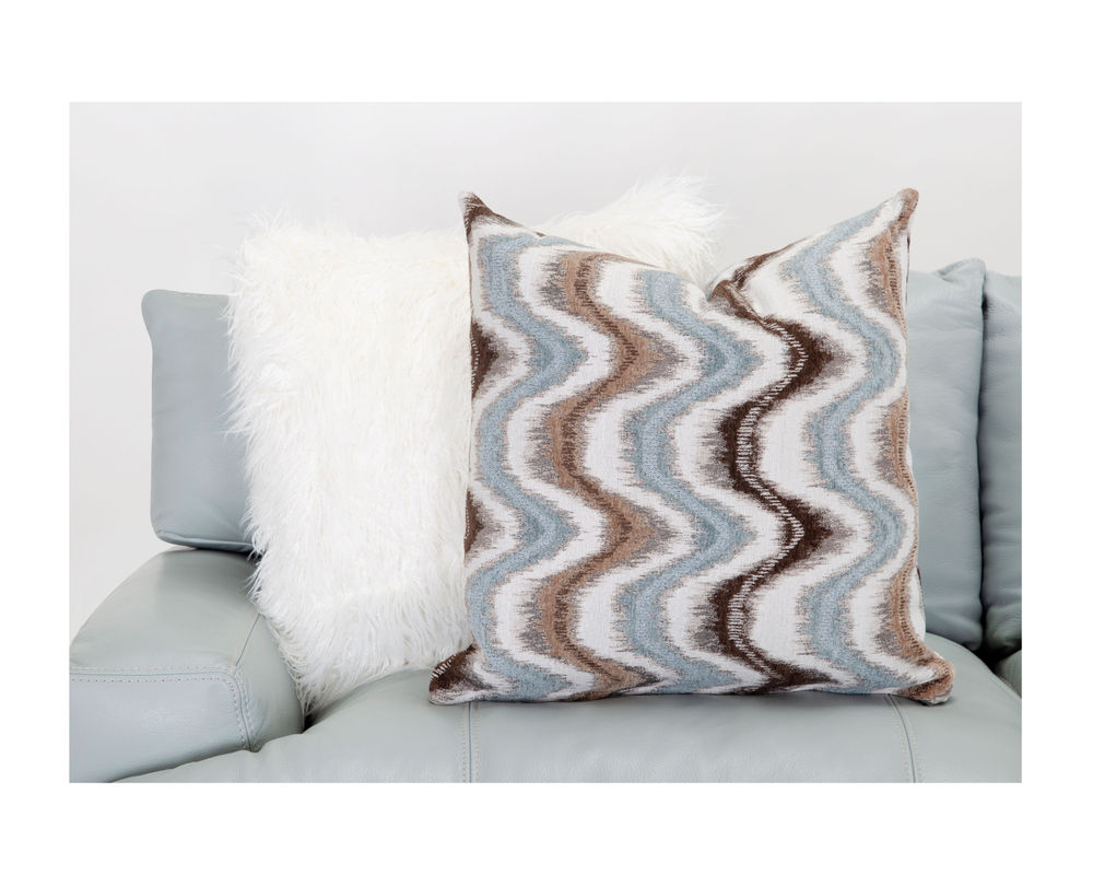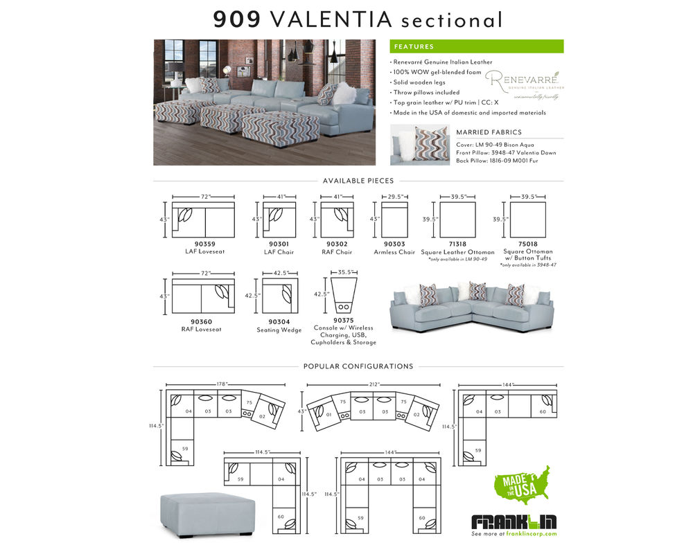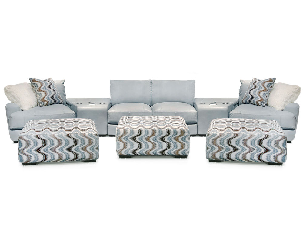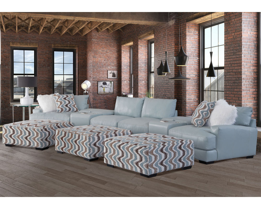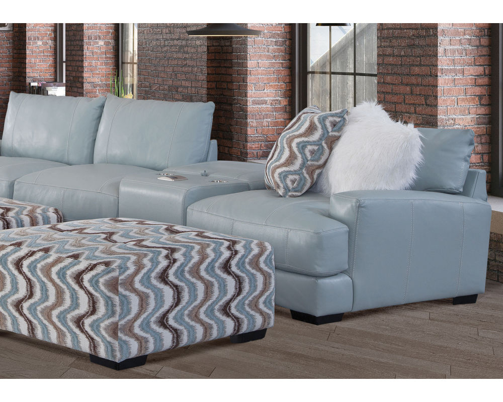 The Valentia leather stationary sectional is upholstered an aqua colored leather Our collection features reversible seat and back cushions for increased comfort and durability. This contemporary sectional can be arranged in various configurations. The accent pillows come in a white faux fur look and a wavy pattern in alternating shades of aqua, tan, black and white called Valentia Dawn. The 71318 ottoman is upholstered in an all over aqua shade of leather. The console comes standard with QI charging, USB, cupholders and storage.