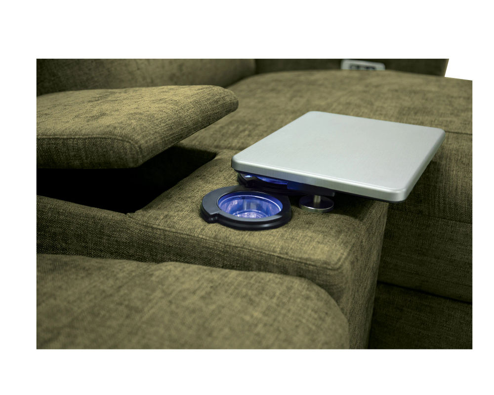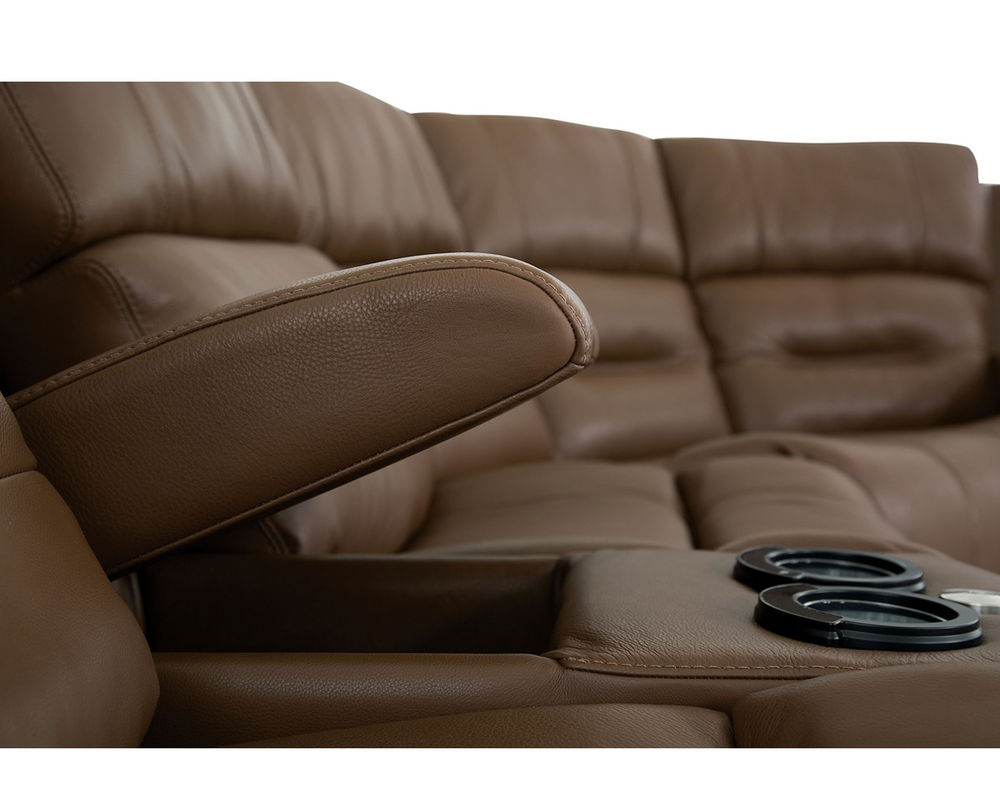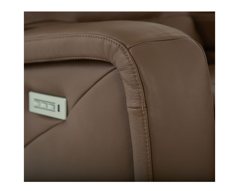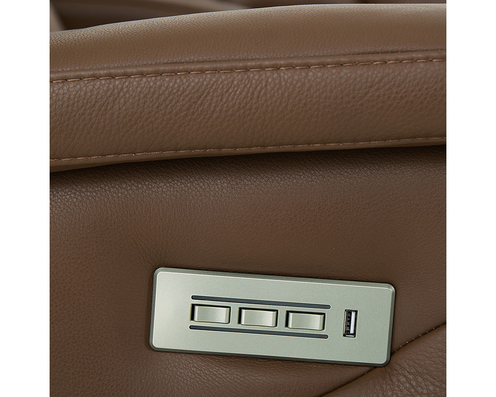 • Power recline and power headrests operated by a brushed metal power switch with integrated USB charging