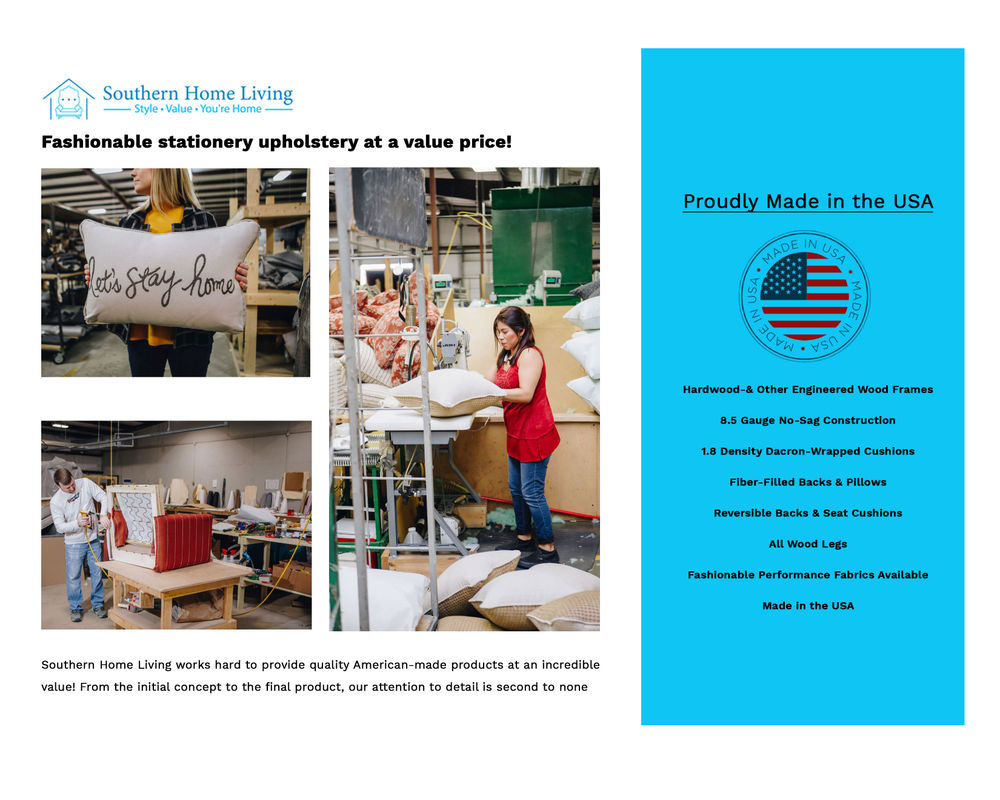 The Palm Beach Iron Two-Piece Sofa Chaise features a left arm facing loveseat and a right arm facing chaise. Palm Beach Iron comes with 6 contrasting pillows in two different fabrics and 2 additional contrasting kidney pillows. The box border seat cushions and welted inside back cushions are all loose and reversible allowing you to rotate them to prolong the life of the cores as well as the life of the fabric. The chaise will not rotate due to the mini t-cushion. Palm Beach Iron features flared arms and dark coffee tapered wood legs.