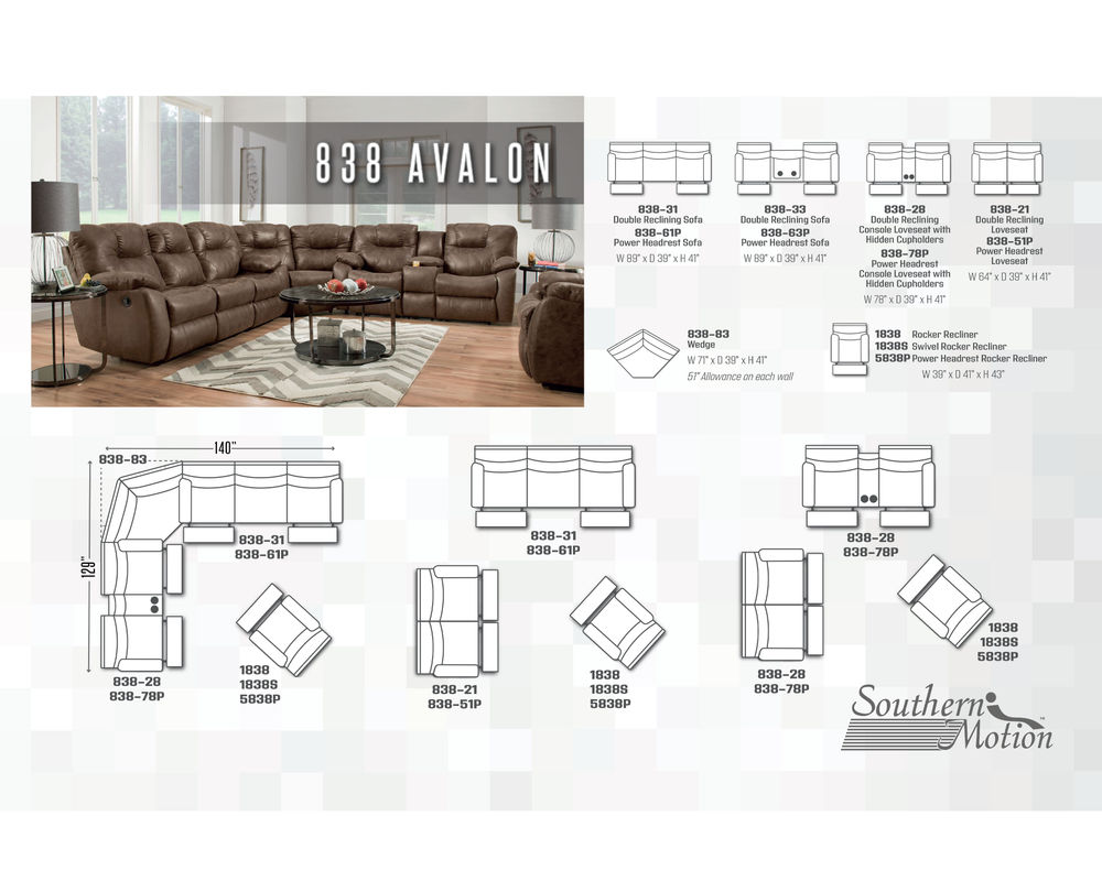 The Southern Motion Avalon 838 Sectional will fill your living room with inviting comfort that will stand the test of time. These sectional pieces are made with hardwood solids and hardwood components.