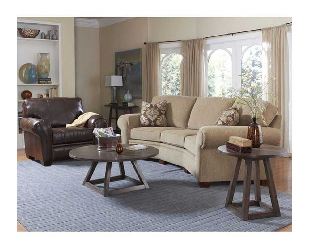 The Broyhill Miller 5300 Conversation Sofa has classic styling to it and is also angled to provide for more engaging conversation. The rolled arms and tapered legs bring it a decorator's touch. Spend leisurely hours relaxing on this sofa or invite your friends over for an evening of wine and conversation.