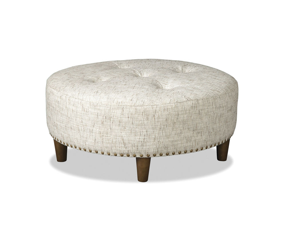Cute as a button, you might say- this cocktail ottoman features a tufting pattern that resembles the face of a button! It also features spaced nail head trim around the base, and conical shaped legs. A plush top makes it perfect for foot resting or extra seating. Optional nail finishes available. Also available without nail head trim. Over 100 high performance fabrics and 15 wood finishes.