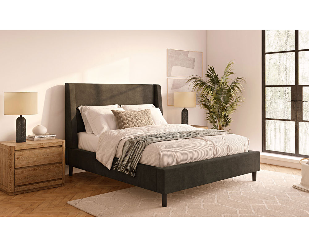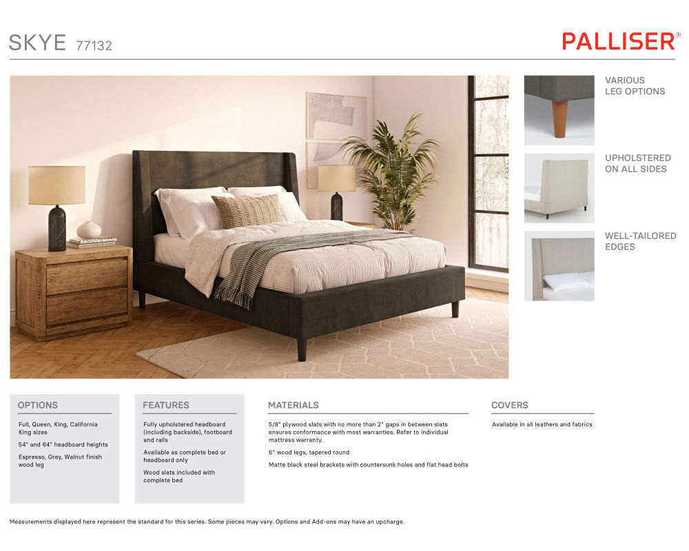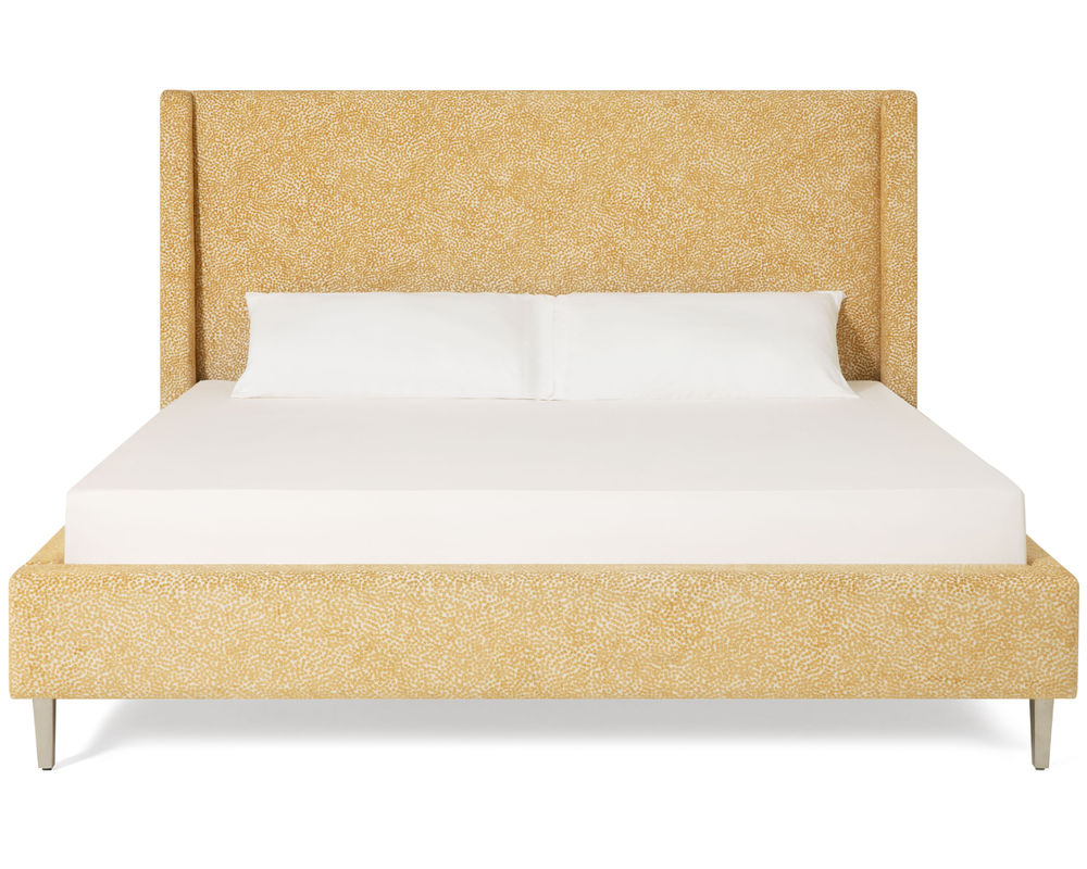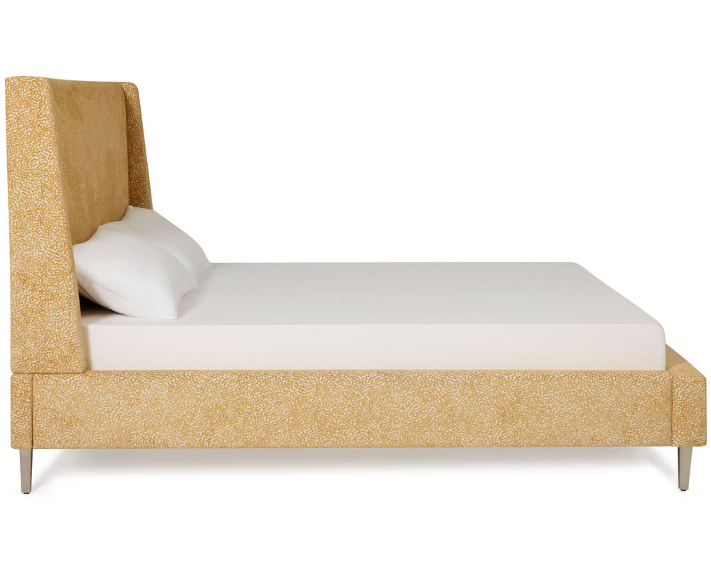 From Sofas and Sectionals.com: Introducing the Skye Complete Bed, a modern and stylish choice for any bedroom. This bed features a unique take on the classic wingback headboard design, with a soft padded face and tapered wings that create a light and open feel. Available in two heights - 54" and 64" - this bed offers the option for a subtle or dramatic visual impact, depending on your style.