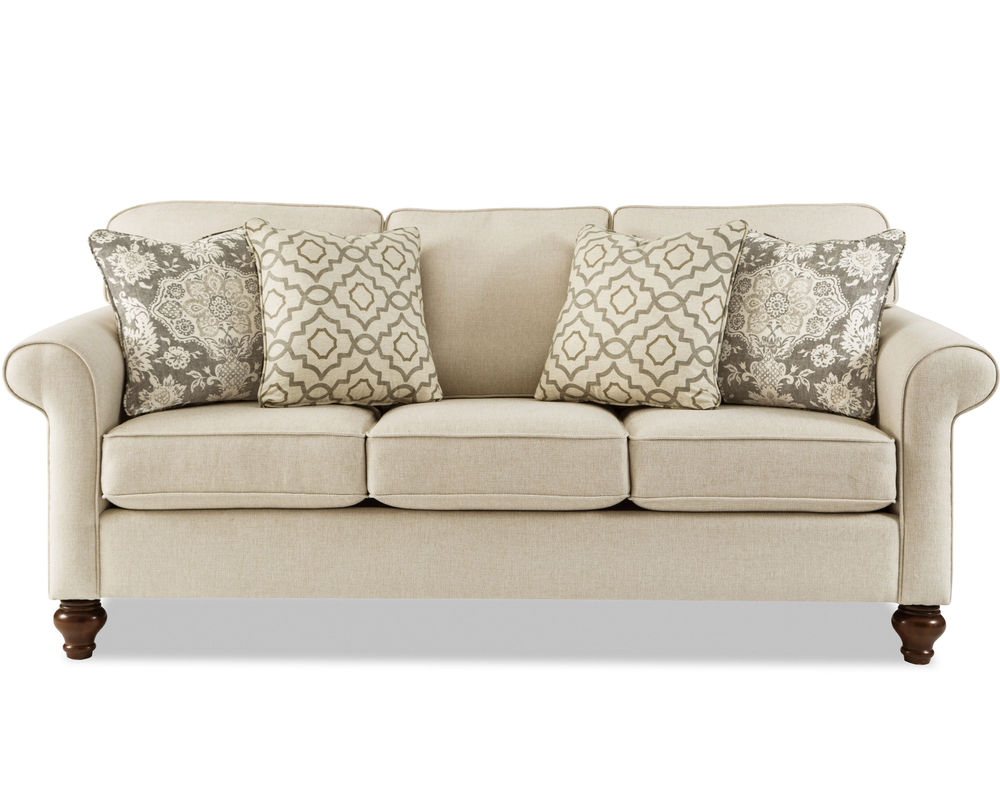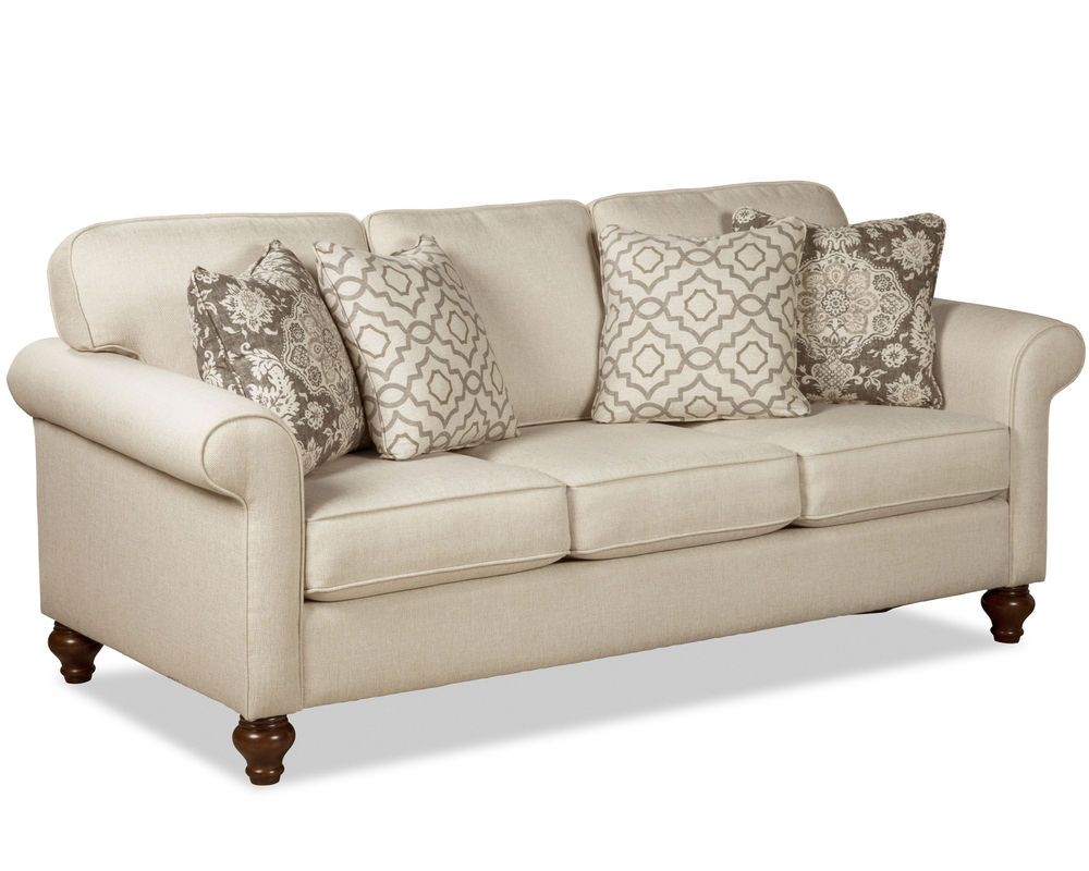 The Delilah 7738 Queen Sleeper is the perfect combination of comfort and style. With its familiar and comfortable design, this classic sleeper sofa features rolled sock arms, semi-attached back pillows, and simple turned legs. It comes with two pairs of pillows as standard and is a great addition to any living space. To complete the look, there is also a matching stationary sofa, loveseat, chair, and ottoman available. Whether it's for a living room or spare bedroom, this sofa is versatile and comfortable enough to fit any lifestyle.