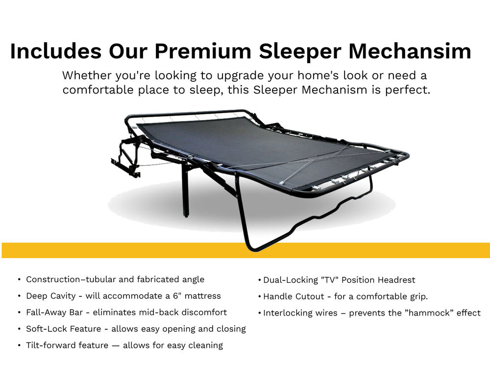 With its tubular and fabricated angle construction, it is durable and strong. The deep cavity can accommodate a 6" mattress for a comfortable night's sleep. It also features a fall-away bar which eliminates mid-back discomfort, and a soft-lock feature that allows for easy opening and closing. The tilt-forward feature allows for easy cleaning underneath, while the Dual-Locking "TV" Position Headrest locks the headrest securely into place for watching TV or reading. The handle cutout allows the user to obtain a comfortable grip, and the interlocking support wires prevent the "hammock" effect and "roll-together" when the unit is in the sleep position. This Sleeper Mechanism is available in varying widths, including twin, full, and queen, and only in standard lengths. Whether you're looking to upgrade your home's look or need a comfortable place to sleep, this Sleeper Mechanism is the perfect option.