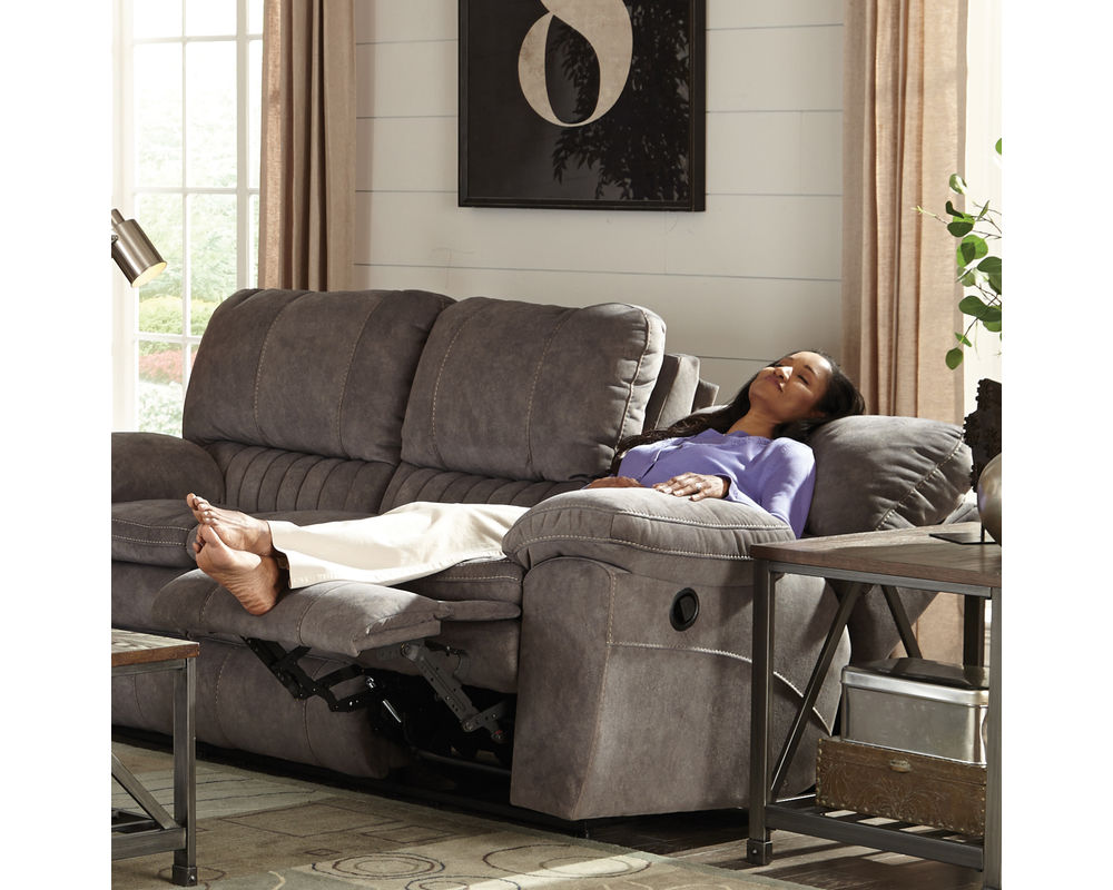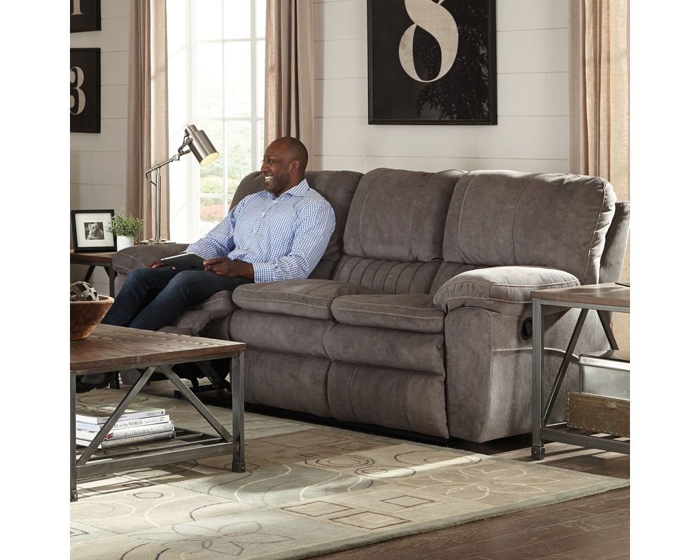 Take control of your comfort with the Reyes 91" Reclining Sofa in Graphite. The ultra-stylish, traditional sofa offers a plush, inviting allure to it and will keep you relaxed for hours at a time. It features a two-over-two cushion design that has cushions with plenty of support and stuffing within them to keep you comfortable. The sofa features a lay-flat reclining feature, so you can recline back as far as you'd like, letting you do everything from watching TV to reading a book to taking a nap. The back cushions are ultra padded and supportive, offering a plush space that will support you regardless of how you're laying. The unique, channel back lumbar cushion attached to the sofa helps to give your lower back the support it needs. It is upholstered with ultra-soft, printed suede fabric to finish off the look.