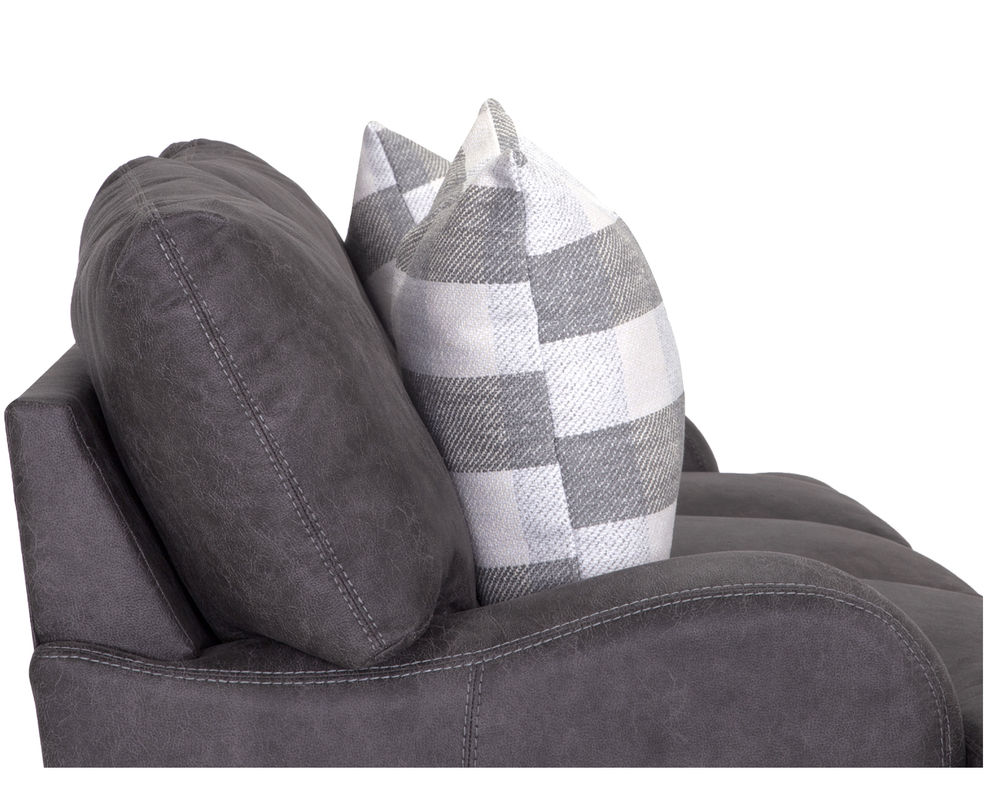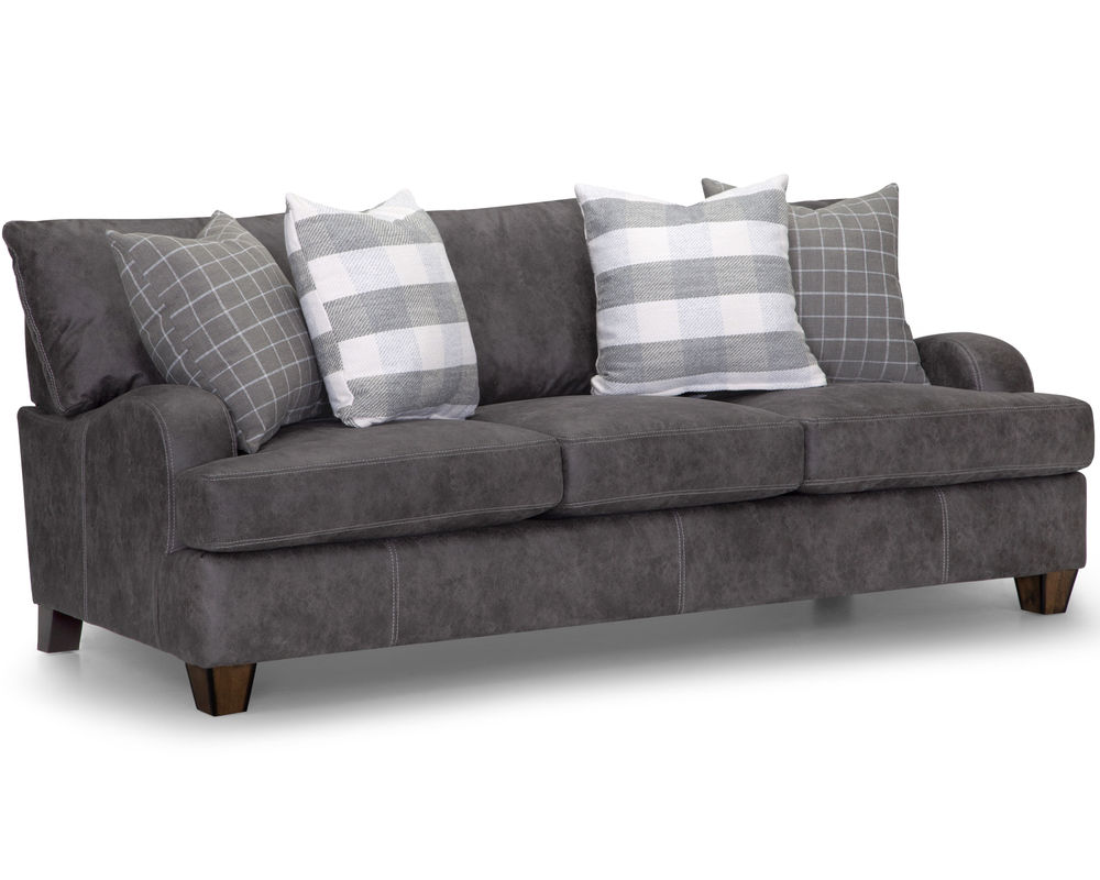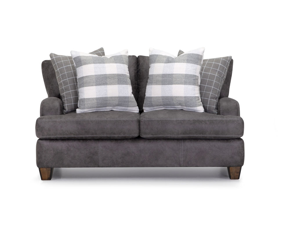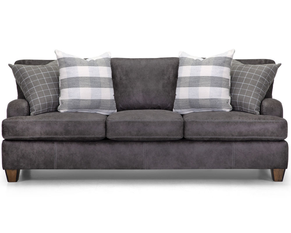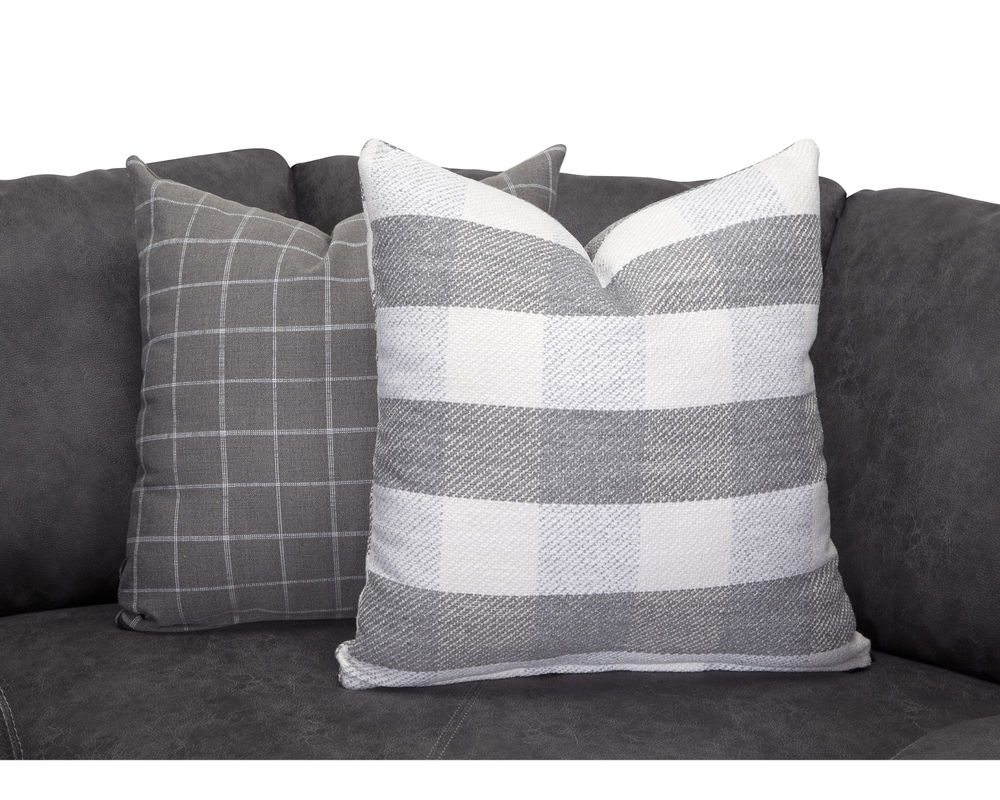 Introducing the stylish and versatile Darby 993 Sofa, designed to elevate your home with its modern farmhouse aesthetic. This stationary sofa group is upholstered in stunning Chief Charcoal color, adding a touch of sophistication to any living space. The plaid accenting throw pillows in shades of gray provide a charming contrast and add a cozy and inviting touch to the overall design.
