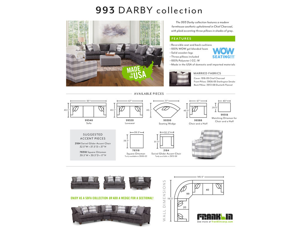 One of the critical features of the Darby 993 Sofa is its versatility. It can be enjoyed as a sofa collection or transformed into a sectional by adding a wedge. This allows you to customize the seating arrangement based on your needs and preferences, making it perfect for any occasion.