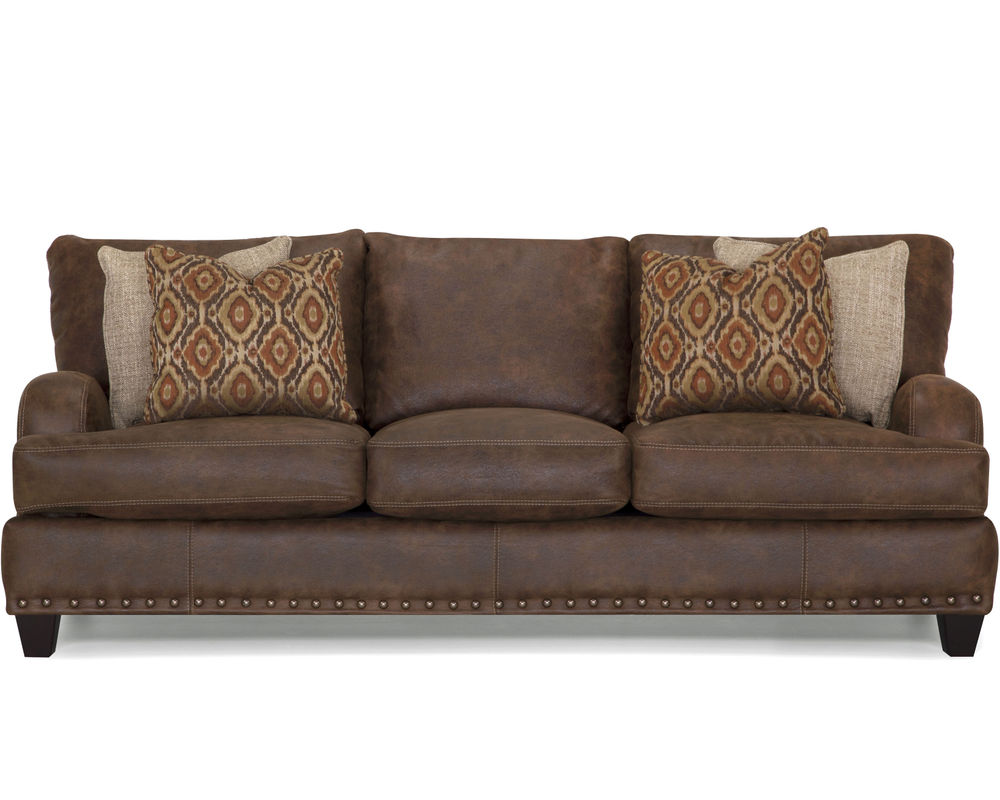 Franklin's 848 Indira Sofa has rugged good looks with a pinch of spice added for flavor. Beautiful faux distressed leather upholstery envelops the T-cushion seats and loose seat backs framed by the contemporary-styled swoop track arms. Contrasting accent pillows inject a zesty color pop in a southwestern print. Bordering the bottom of the front seat rail is a row of bold antique brass nail-head trim, adding rustic charm. Easy care faux leather fabric makes maintenance and cleanup a breeze. Franklin's WOW seating system delivers the best available seating with its unique combination of gel-injected foam and premium springs. Franklin's passion for their American-made product and obsession with quality is evident in their fine furnishings and willingness to stand behind their product with the best warranty in the industry, with a lifetime warranty on the reclining mechanism, all other metal parts, and wooden frame parts. This is possible because Franklin fabricates their own foam, stamps their reclining mechanisms, and cuts their wooden frames.