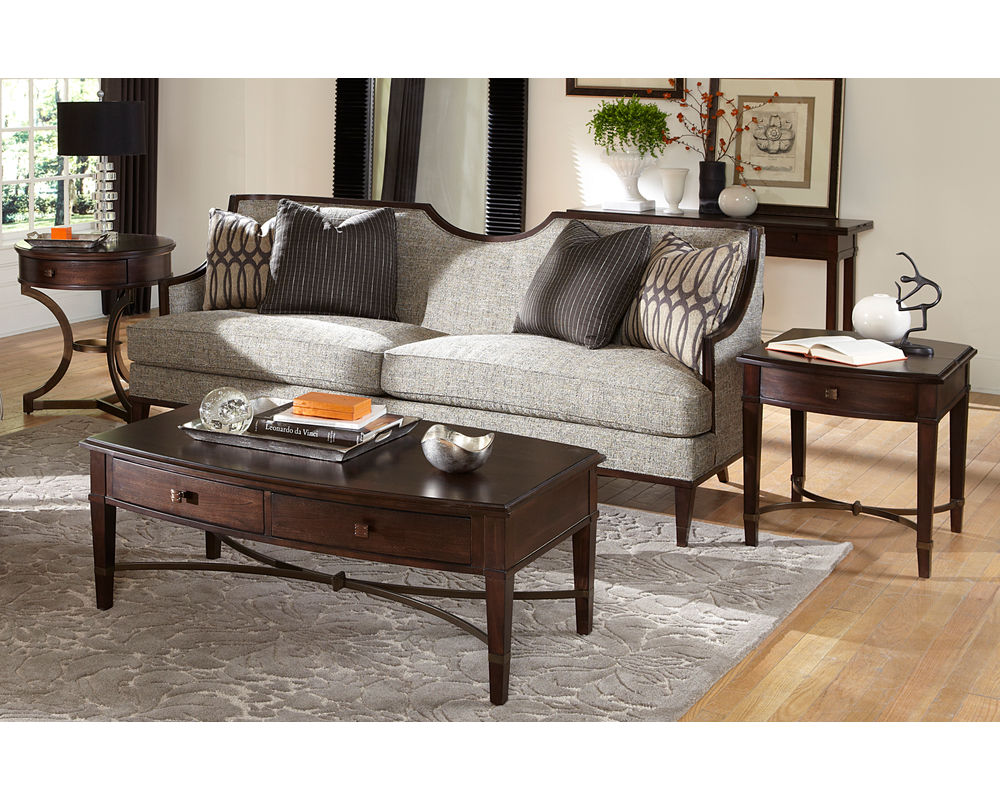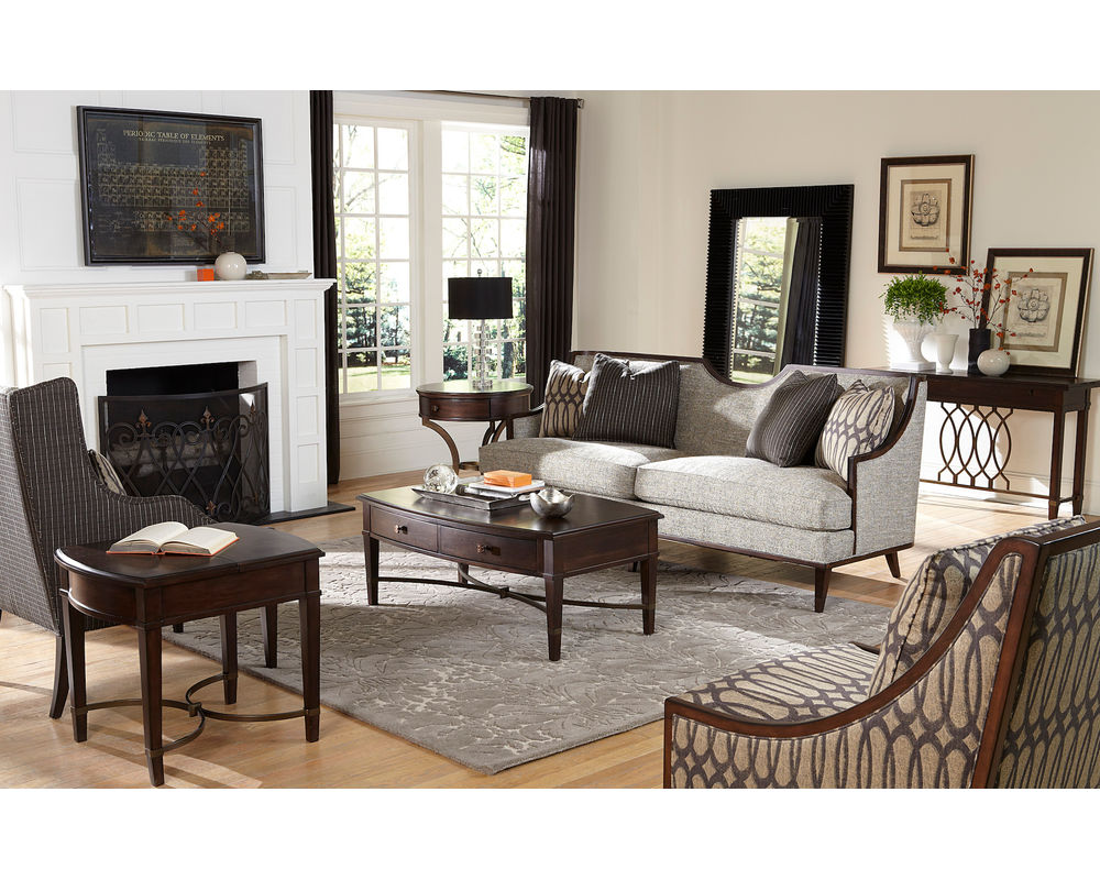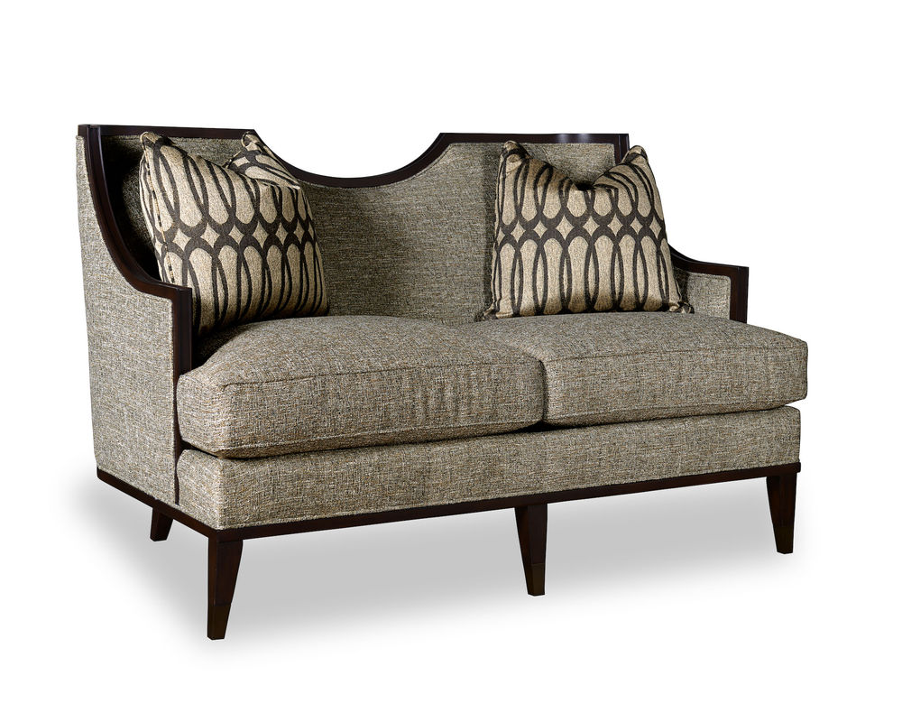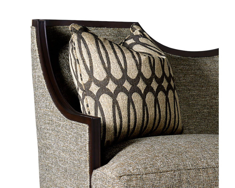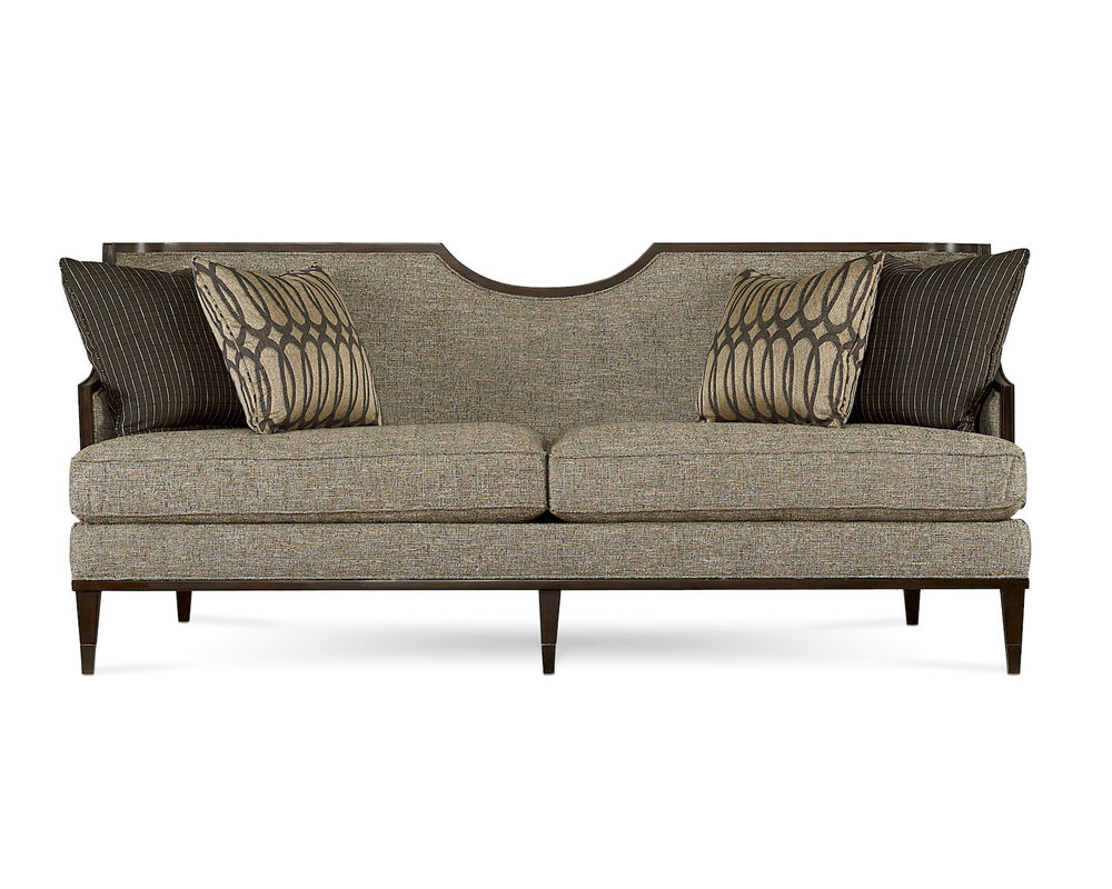 Clean and classic, the sleek Harper Mineral Sofa brings together elements of both contemporary and traditional design: square tapered wood legs, exposed wood frame, curved arms, and a reverse half moon cut out on the back. The sofa’s comfort, however, is 100 percent modern: tailored upholstered back and deck and two down-blend seat cushions all in a flecked gray, black and brown fabric, plus two pairs of down blend throw pillows, including two covered in the iconic interlocking marquise pattern that is a design motif for the Intrigue Collection. In addition to the sofa, the Harper Mineral collection includes a loveseat, matching chair, wood trim accent chair, and tight seat wing chair.