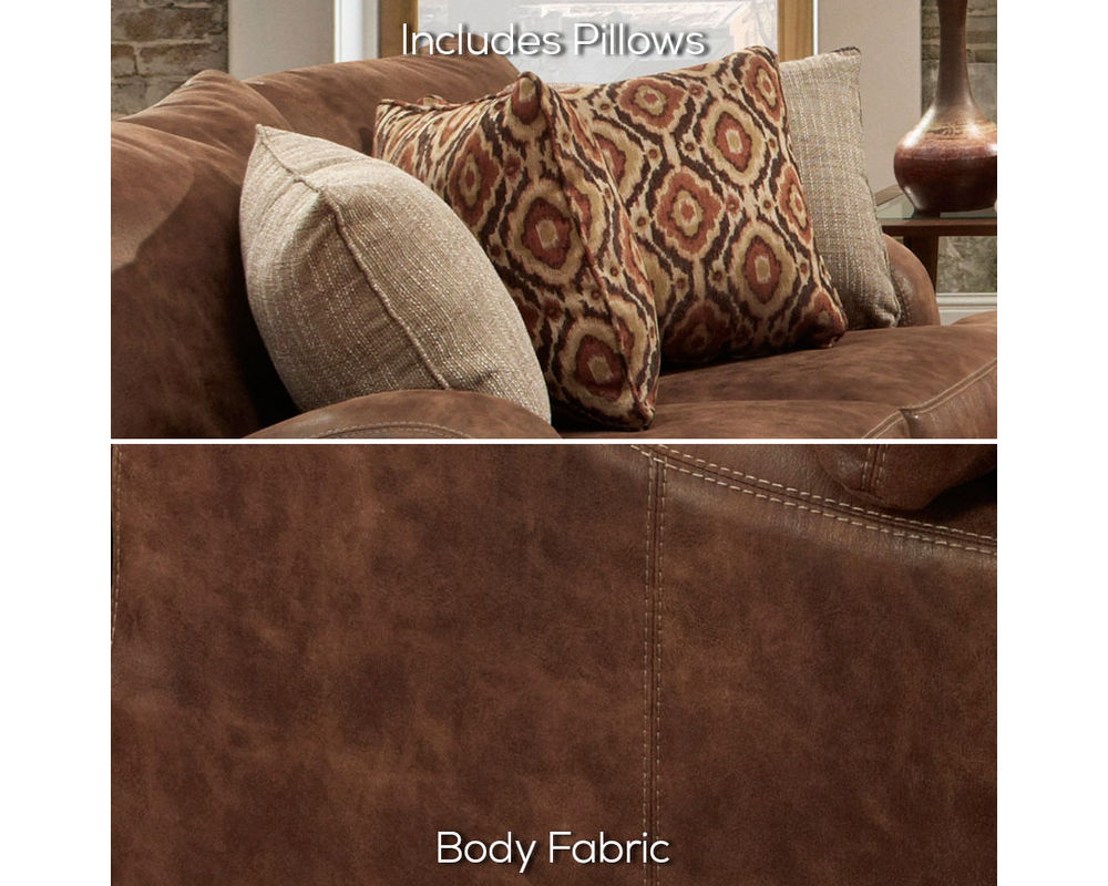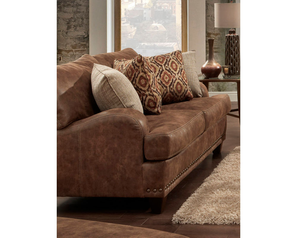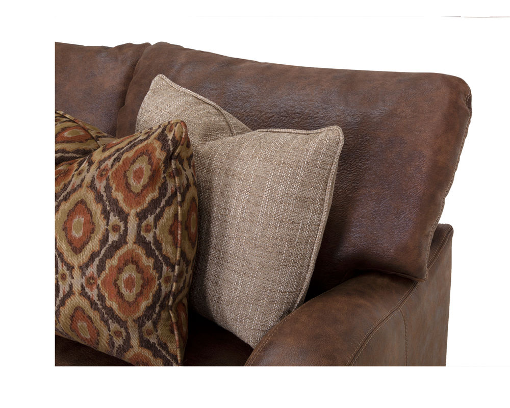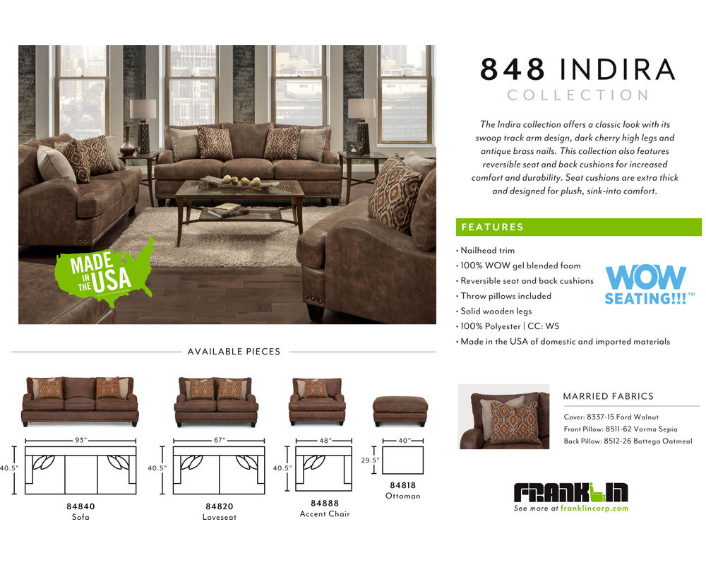 Franklin's 848 Indira Sofa has rugged good looks with a pinch of spice added for flavor. Beautiful faux distressed leather upholstery envelops the T-cushion seats and loose seat backs framed by the contemporary-styled swoop track arms. Contrasting accent pillows inject a zesty color pop in a southwestern print. Bordering the bottom of the front seat rail is a row of bold antique brass nail-head trim, adding rustic charm. Easy care faux leather fabric makes maintenance and cleanup a breeze. Franklin's WOW seating system delivers the best available seating with its unique combination of gel-injected foam and premium springs. Franklin's passion for their American-made product and obsession with quality is evident in their fine furnishings and willingness to stand behind their product with the best warranty in the industry, with a lifetime warranty on the reclining mechanism, all other metal parts, and wooden frame parts. This is possible because Franklin fabricates their own foam, stamps their reclining mechanisms, and cuts their wooden frames.
