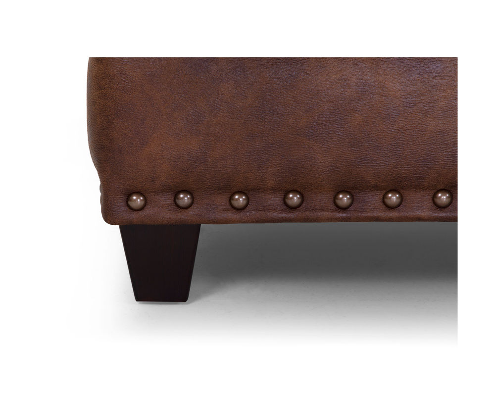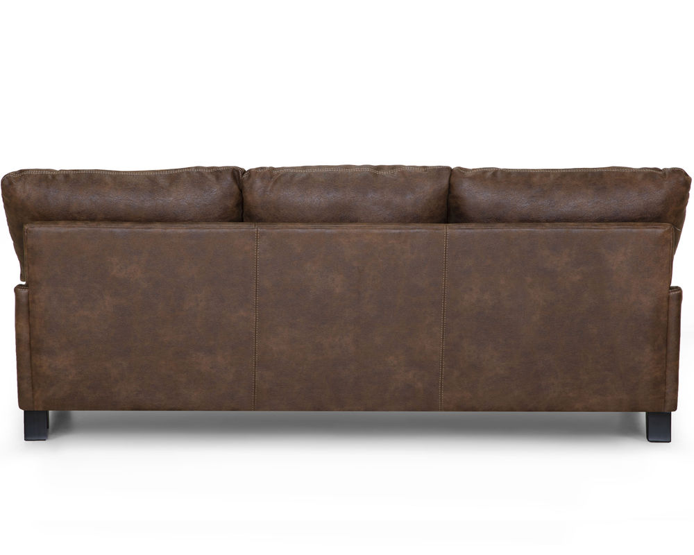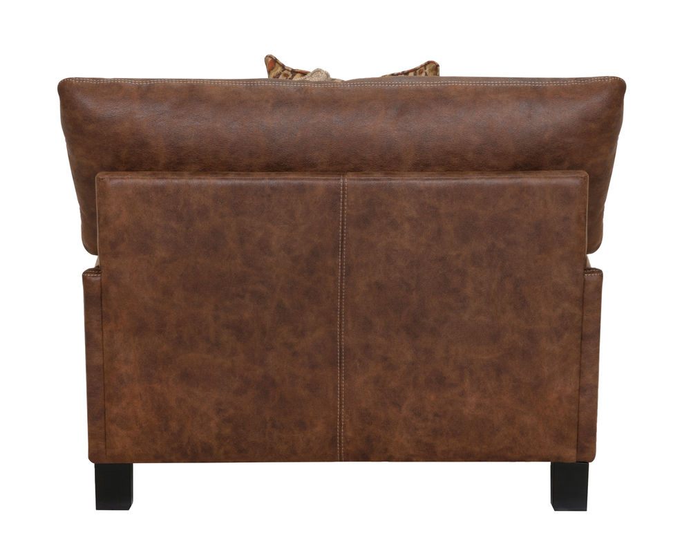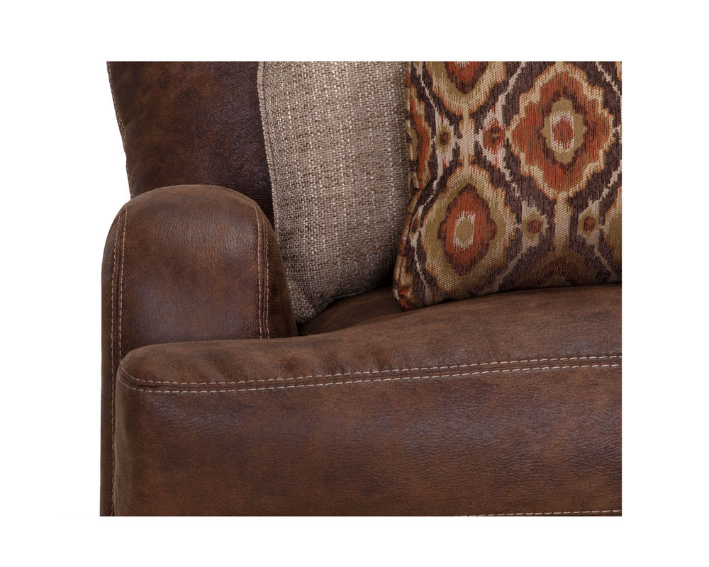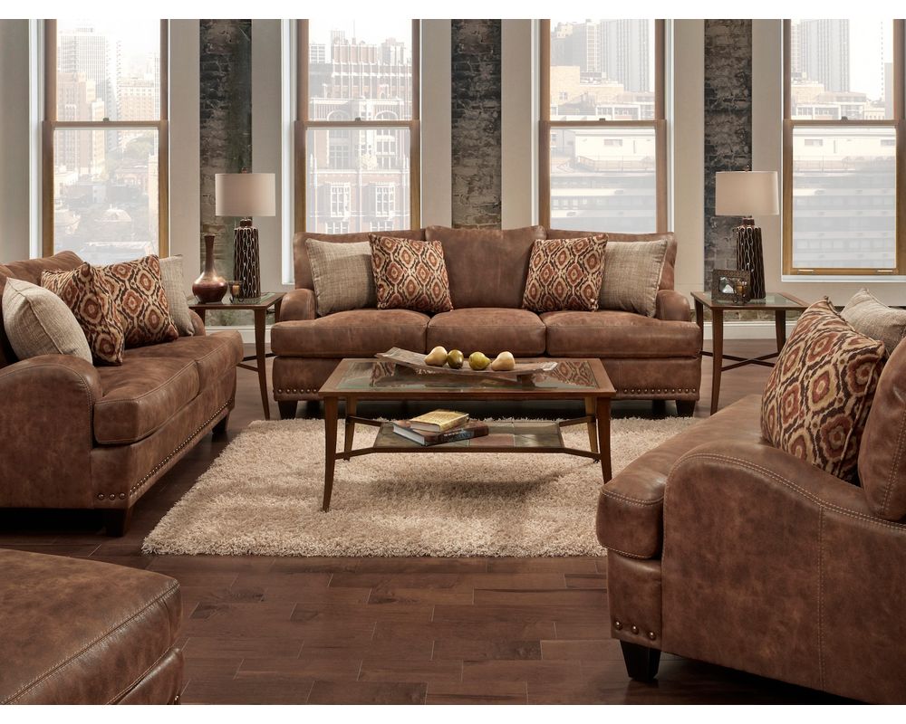 Franklin's 848 Indira Sofa has rugged good looks with a pinch of spice added for flavor. Beautiful faux distressed leather upholstery envelops the T-cushion seats and loose seat backs framed by the contemporary-styled swoop track arms. Contrasting accent pillows inject a zesty color pop in a southwestern print. Bordering the bottom of the front seat rail is a row of bold antique brass nail-head trim, adding rustic charm. Easy care faux leather fabric makes maintenance and cleanup a breeze. Franklin's WOW seating system delivers the best available seating with its unique combination of gel-injected foam and premium springs. Franklin's passion for their American-made product and obsession with quality is evident in their fine furnishings and willingness to stand behind their product with the best warranty in the industry, with a lifetime warranty on the reclining mechanism, all other metal parts, and wooden frame parts. This is possible because Franklin fabricates their own foam, stamps their reclining mechanisms, and cuts their wooden frames.