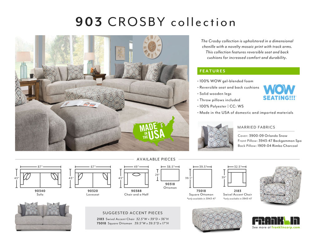 Introducing the Crosby 903 Sofa, a luxurious addition to any living space. This beautiful sofa is part of the Crosby collection, known for its impeccable design and unparalleled comfort. Upholstered in a dimensional chenille fabric, this sofa boasts a unique novelty mosaic print that adds a touch of elegance and character to any room.