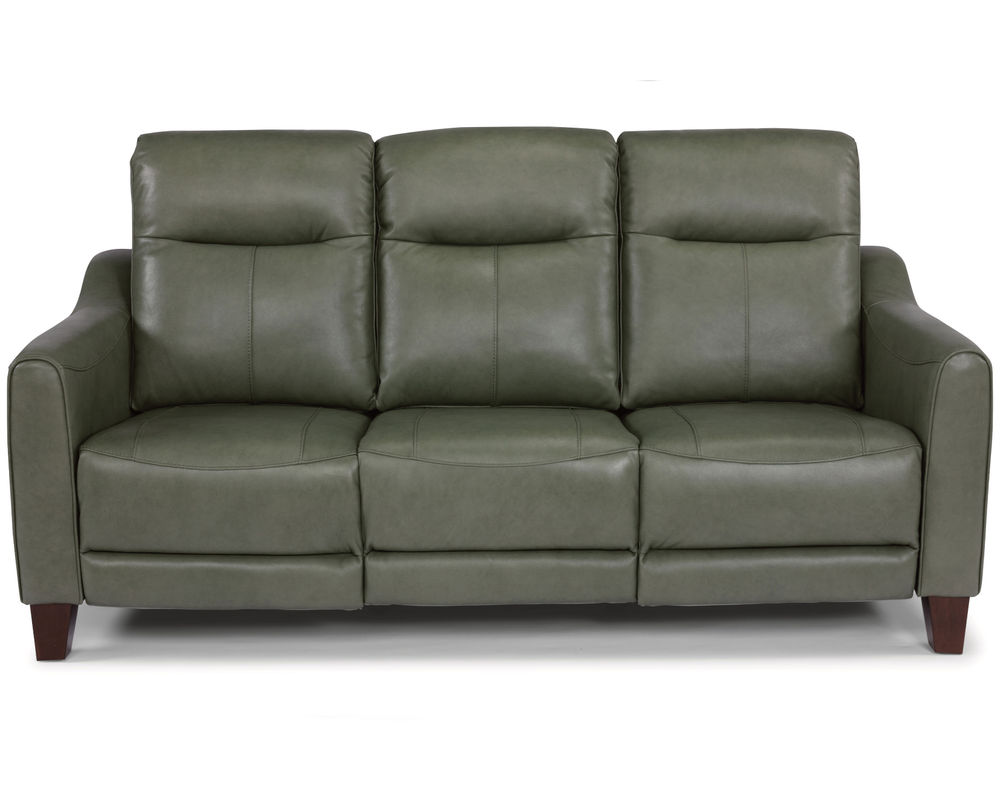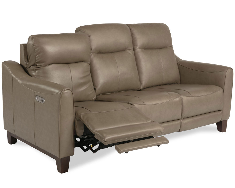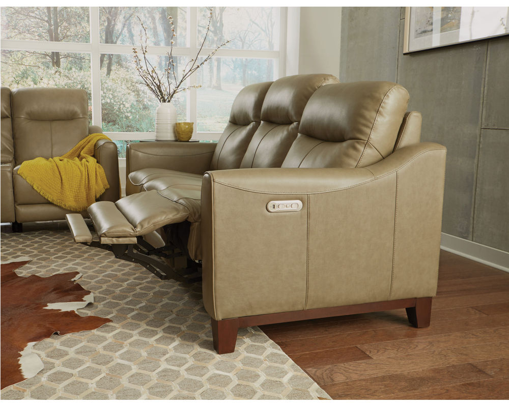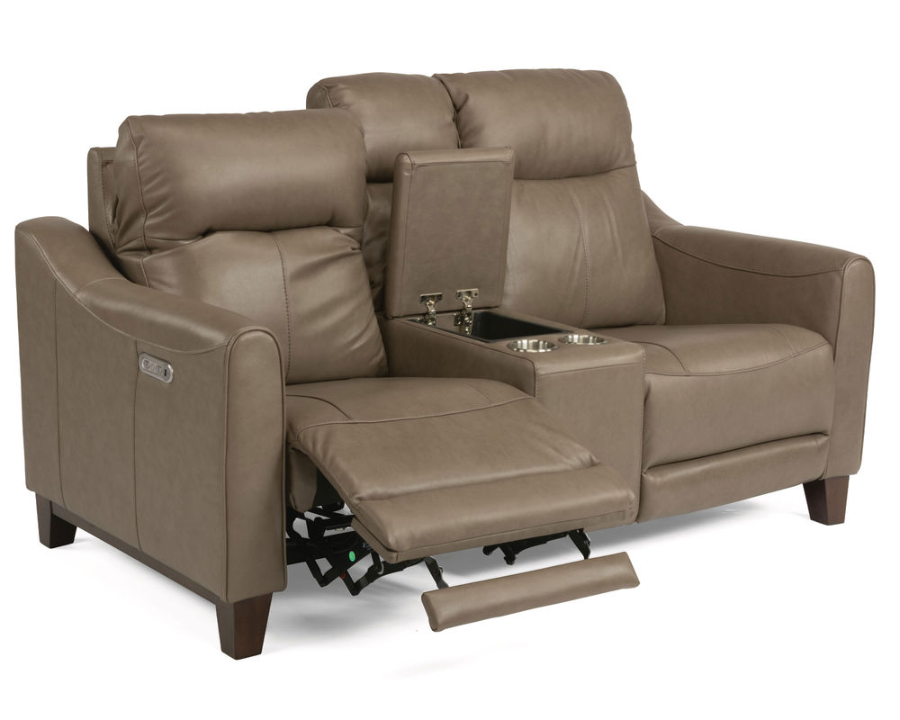 Keep all the essentials for a fun night in close at hand with the Forte Power Reclining Loveseat with Console and Power Headrests. The loveseat's convenient storage console with beverage holders offers plenty of space to house remotes and personal items. Both people sitting can personalize their experience with an easy-to-access power control that independently adjusts the recline and headrests. With convenient USB charging ports built into the controls, you won't have to worry about keeping devices powered up. Enjoy all these comfort-enhancing features-and get the look of sophisticated stationary seating-with design details including tapered wood legs that sit higher off the ground and saddle-stitched soft track arms. Rounding out this loveseat's premium features is our patented Flexsteel DualFlex Spring System™, which offers a mix of firmness and flexibility as you sit. Choose from two options of our premium leather upholstery for a design that elevates any space.