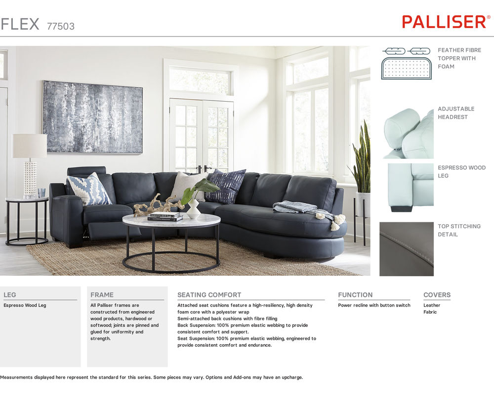Distinctive and beautiful, the Palliser Flex 77503 Sofa is the perfect example of style and luxury working in perfect harmony. Invoking a sleek contemporary design and a set of wonderful comfort features, this piece is the perfect addition to nearly any home decor. Additionally, keeping with Palliser's tradition of customization, this piece can be built in your choice of fabrics or leathers across a broad range of colors.